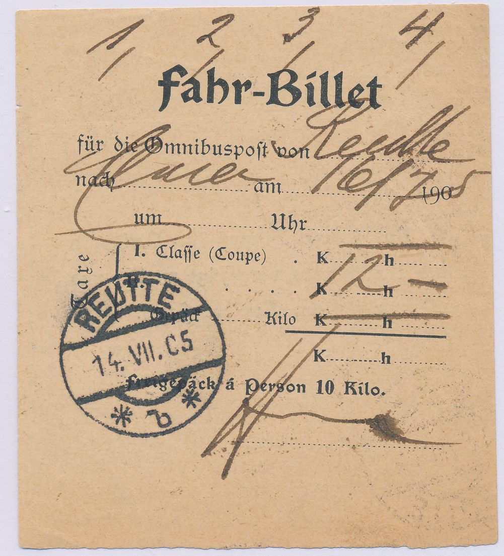 Fahr-Billet für die Omnibuspost mit Stempel Reutte 14.7.05