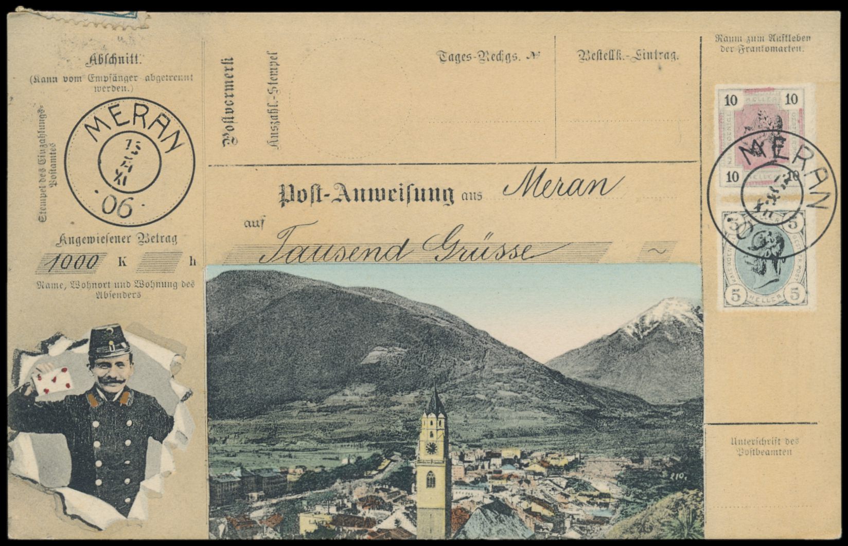mehrfarbige Ansichtskarte "Post-Anweisung aus Meran" , Frankatur Österreich 5 H., 1906 nach Berlin, Bedarf