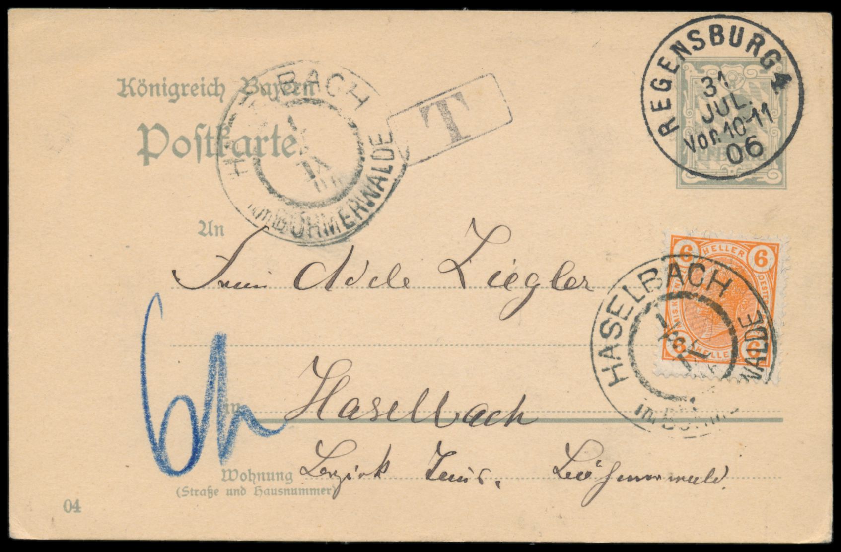 Bayern-Ganzsache 2 Pf. mit Stempel Regensburg 31.7.06 nach Haselbach, unterfrankiert, T-Stempel, handschriftlich Nachgebühr 6 Heller, Freimarke 6 Heller (Ausgabe 1905) als Portomarke frankiert, Stempel Haselbach 1.8.06, Bedarf