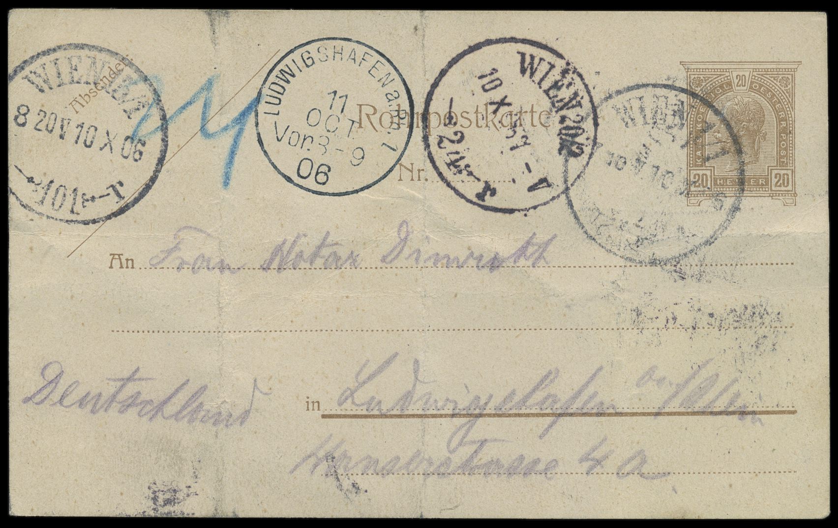 Rohrpostkarte 20 H. (Ausgabe 1904) ohne Zusatzfrankatur nach Deutschland, Rohrpoststempel Wien 1/1, Wien 20/2 und Wien 3/1 10.10.1906, Ankunftstempel Ludwigshafen a. Rh. 1 11.10.06, langer Bedarfstext, übliche Büge