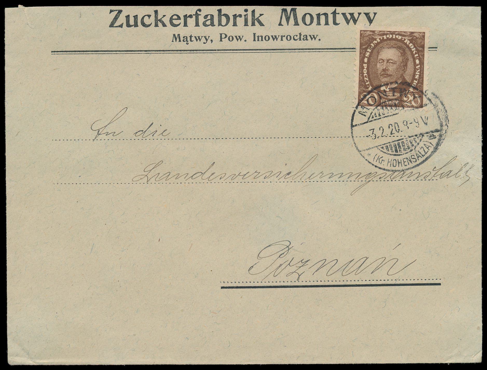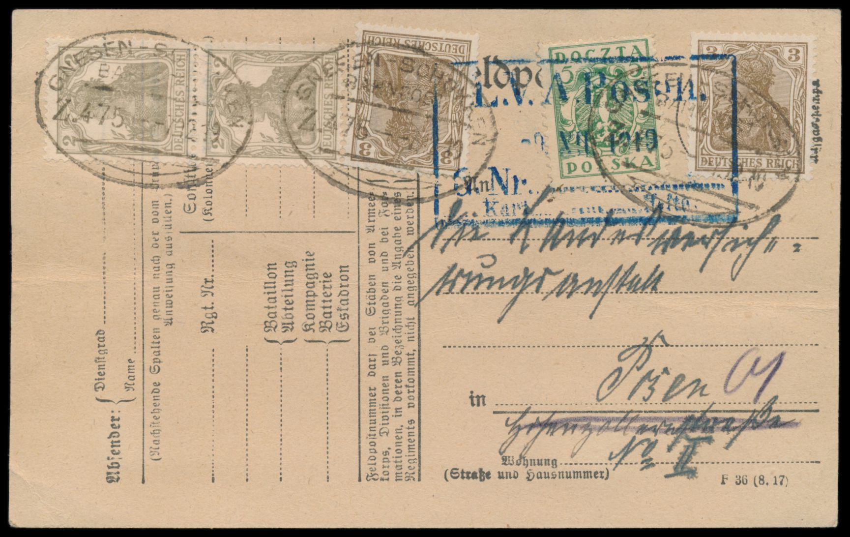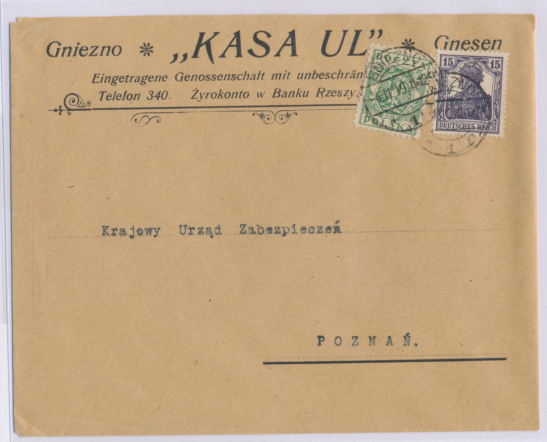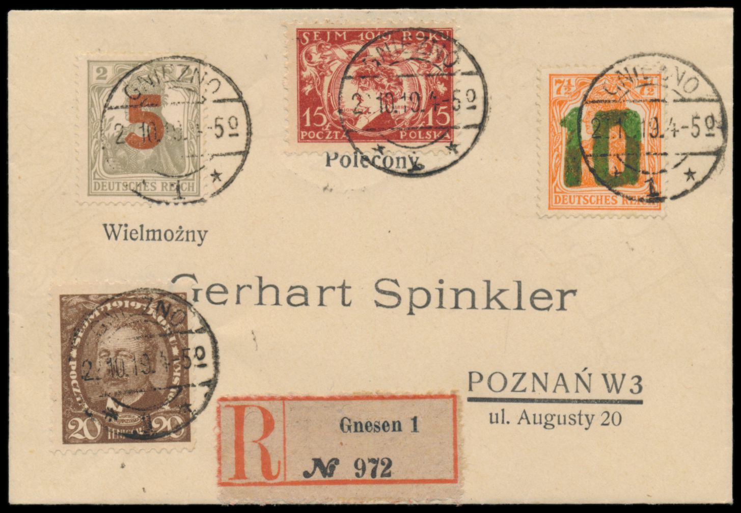 Gnesener Aushilfsausgabe: 5 f auf 2 Pf. und 10 f auf 7 1/2 Pf. mit Sejm 15 f und 20 f auf Einschreibbrief mit gedruckter Adresse nach Poznan, aptierter deutscher Stempel Gniezno 1 22.10.19, Ankunftstempel Poznan 3 23.10.19