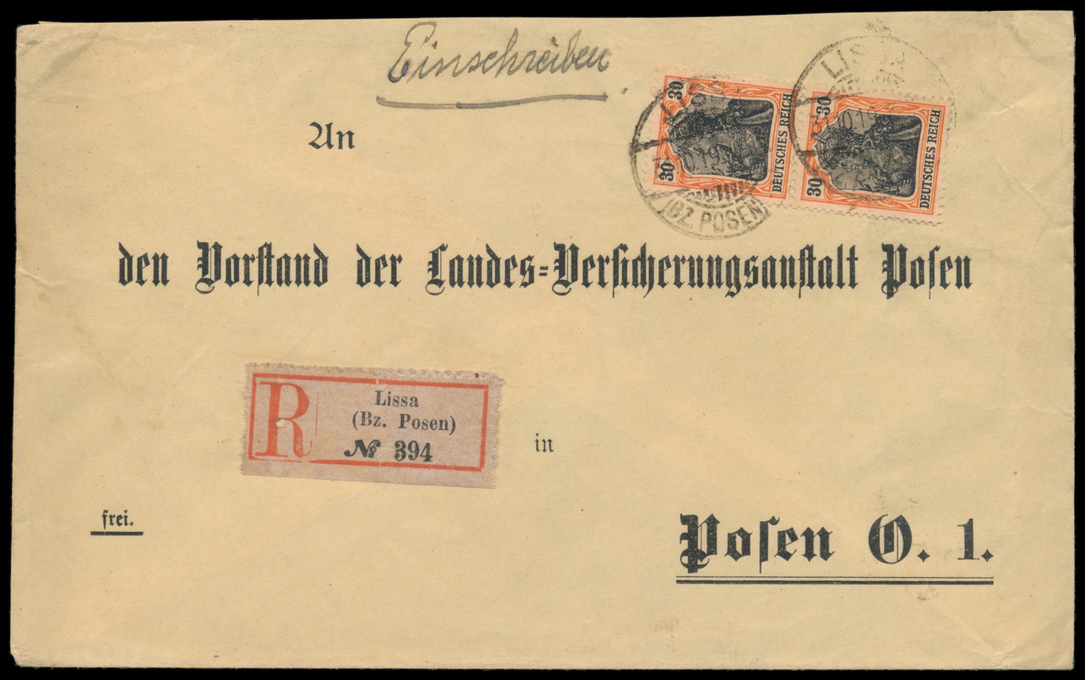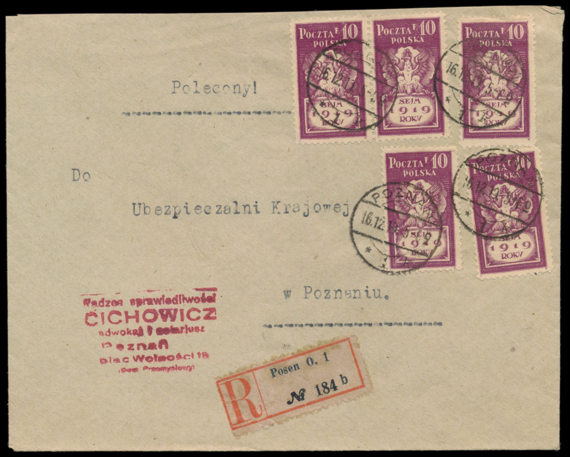 5 x  10 f Sejm  auf  Orts-Einschreibbrief,  aptierter deutscher Stempel  Poznan 1  16.12.19, deutscher  R-Zettel Posen O. 1,  schwacher senkrechter Mittelbug, Bedarf