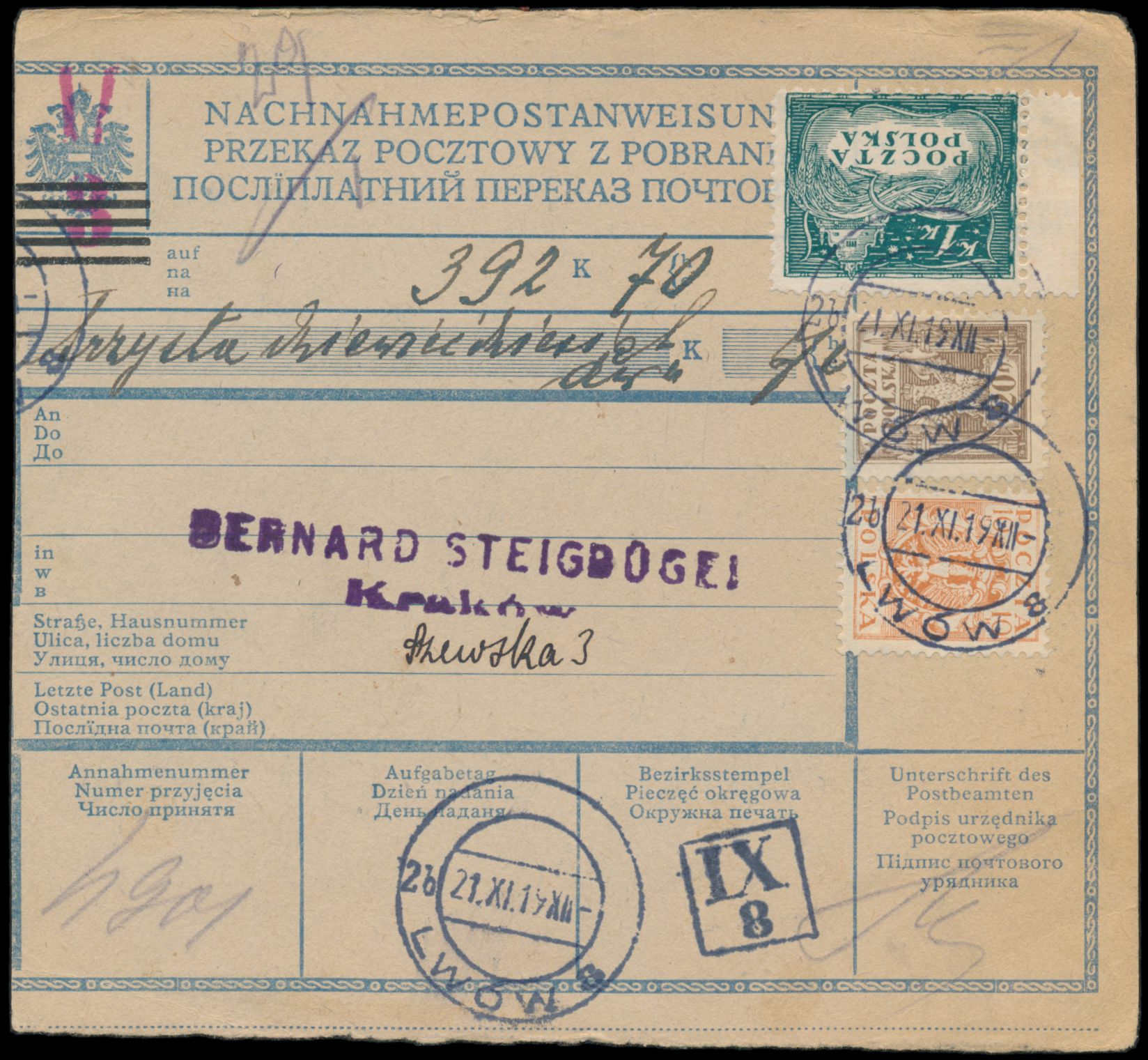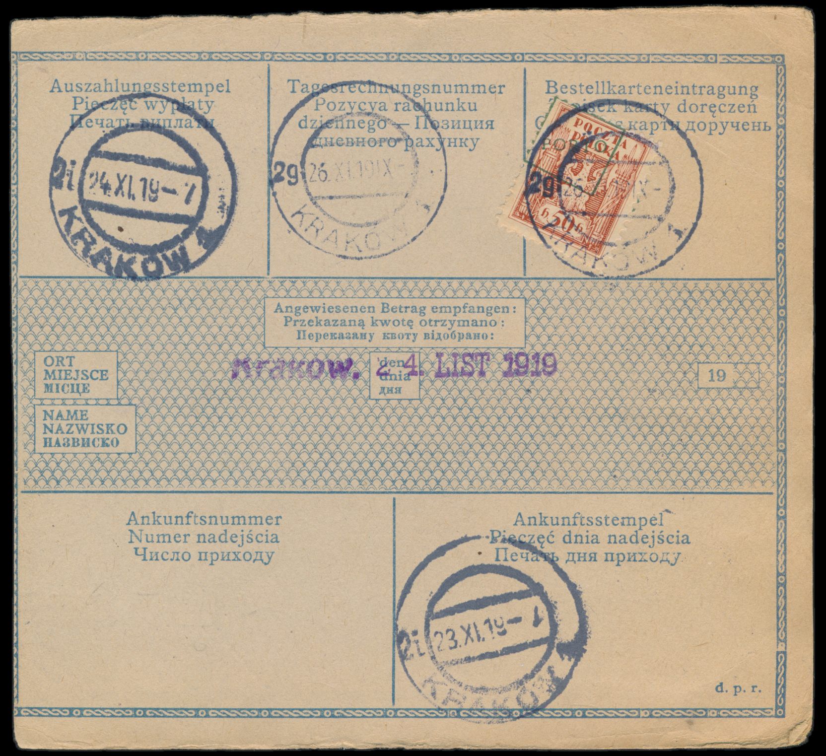 Nachnahme-Postanweisung auf 392 K. (dreisprachiges österreichisches Formular), Frankatur 10 H., 20 h. und 1 K., aptierter Stempel Krakow 8 21.11.19, nach Krakow, rückseitig Aushilfsportomarke 50 H. mit lokalem grünen Maschinenaufdruck "Porto" (Fischer Nr. Pd 28), aptierter Stempel Krakow 1 26.11.19