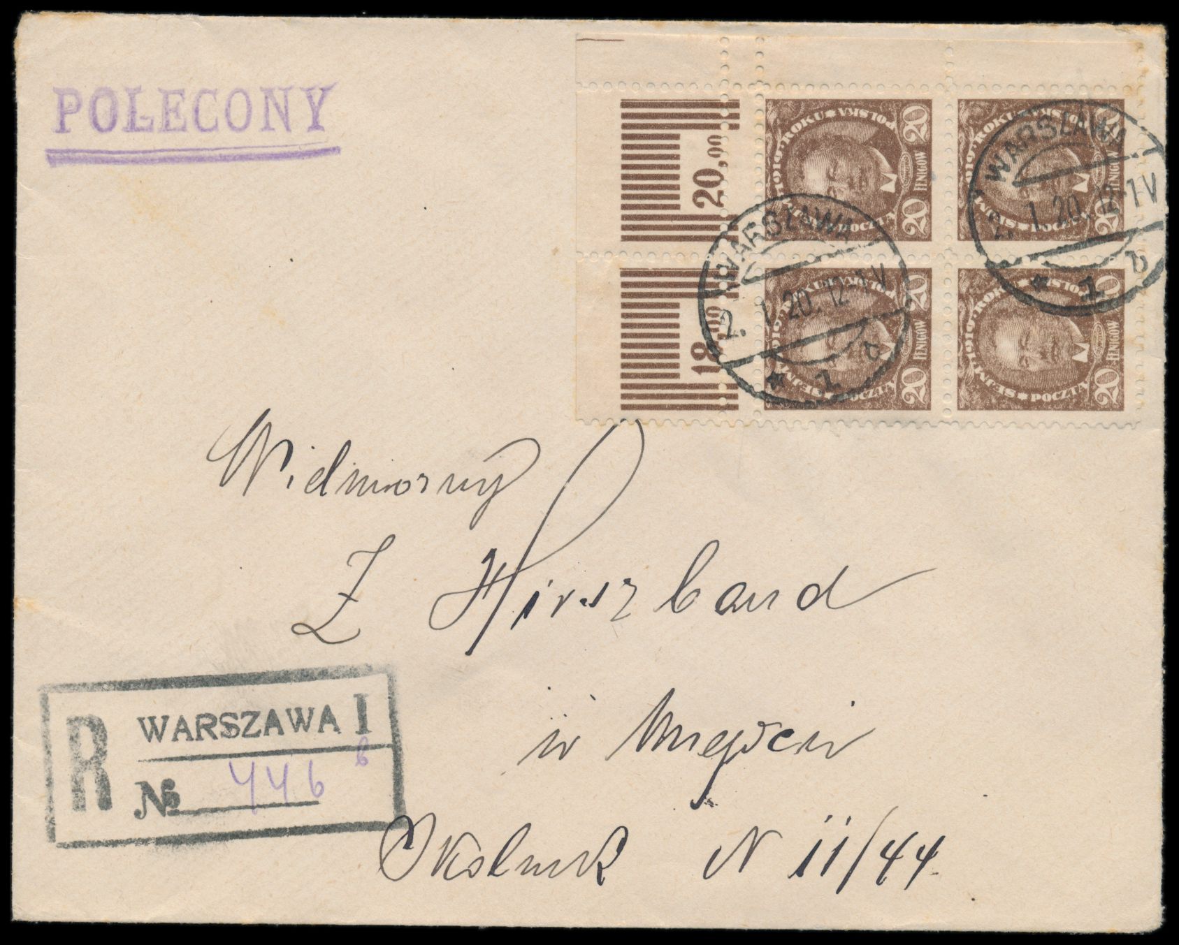 Oberrand-Viererblock 20 F. Trampczynski mit Doppelzähnung im Oberrand auf philatelistischem Einschreibbrief, aptierter deutscher Stempel Warszawa 1 b 2.1.20 uns R-Stempel mit handschriftlicher Nr.