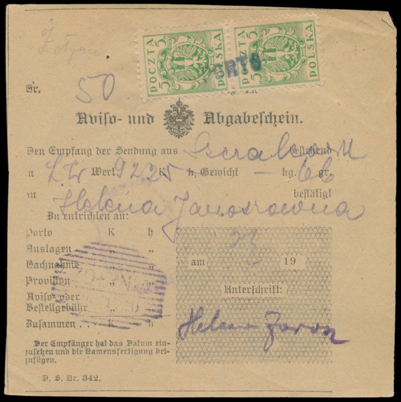 Aviso- und Aufgabeschein (österreichisches Formular) mit senkrechtem Paar Aushilfsportomarke 5 H. mit Handstempelaufdruck Porto" von Zolynia (Fischer Nr. Pd 2), österreichischer Stempel Zolnynia 24.1.20, Bedarf