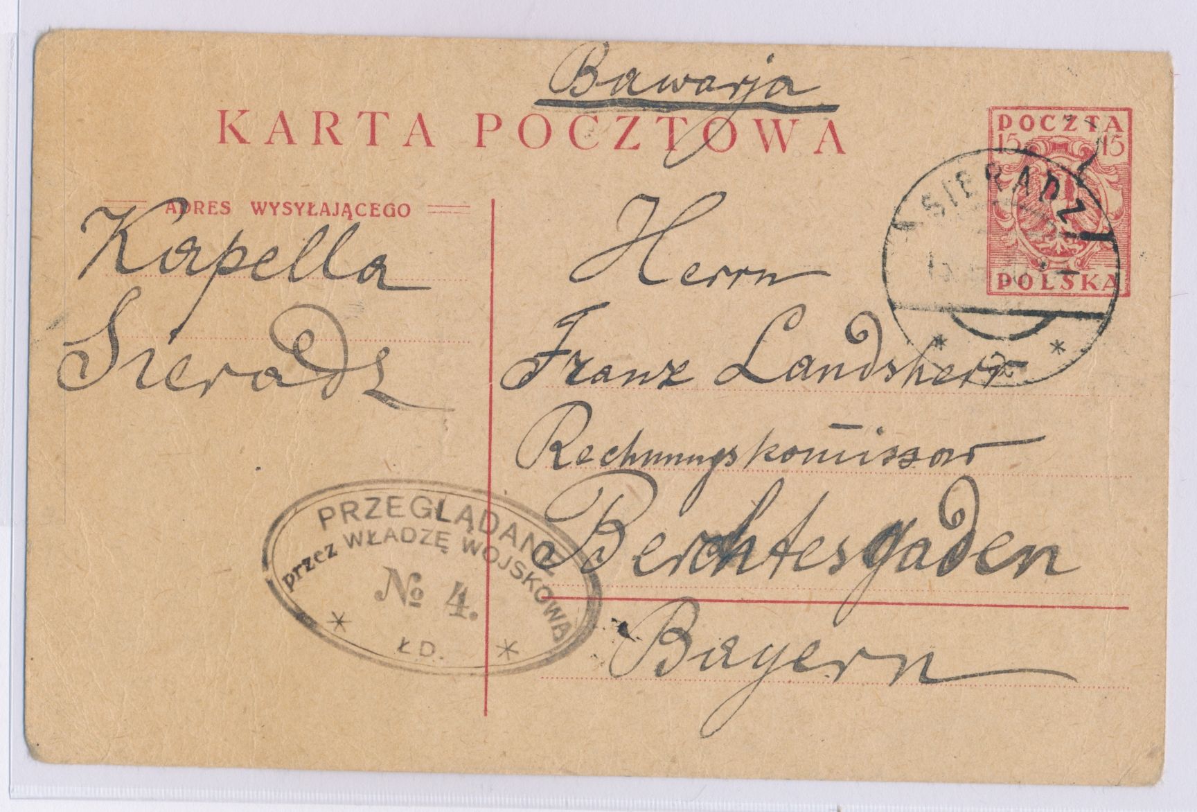 Ganzsache 15 F. mit Stempel Sieradz 13.8.20 nach Deutschland, Ovalstempel der Zensurstelle Lodz mit No. 4, selten deutlicher Abschlag, Bedarf