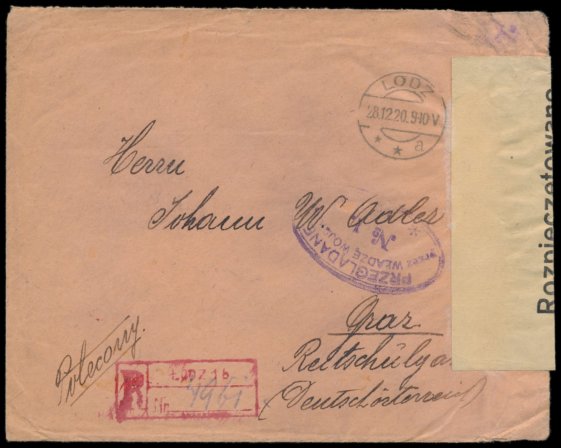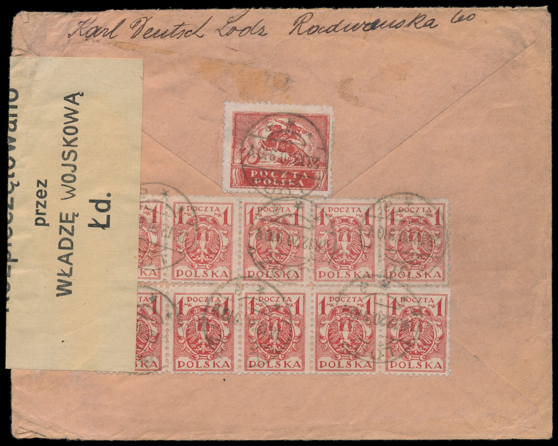 10 x 1 M. und 10 M. rückseitig auf Einschreibbrief mit deutschem Stempel Lodz a 28.12.20 nach Österreich, roter R-Stempel mit handschriftlicher Nr., rechts seltener Verschlußzettel "Rozpieczetowano przez Wladze Wojskowa Ld." und gleichlautender Ovalstempel mit Inhalt No. 1 der Zensurstelle Lodz in violett, Bedarf
