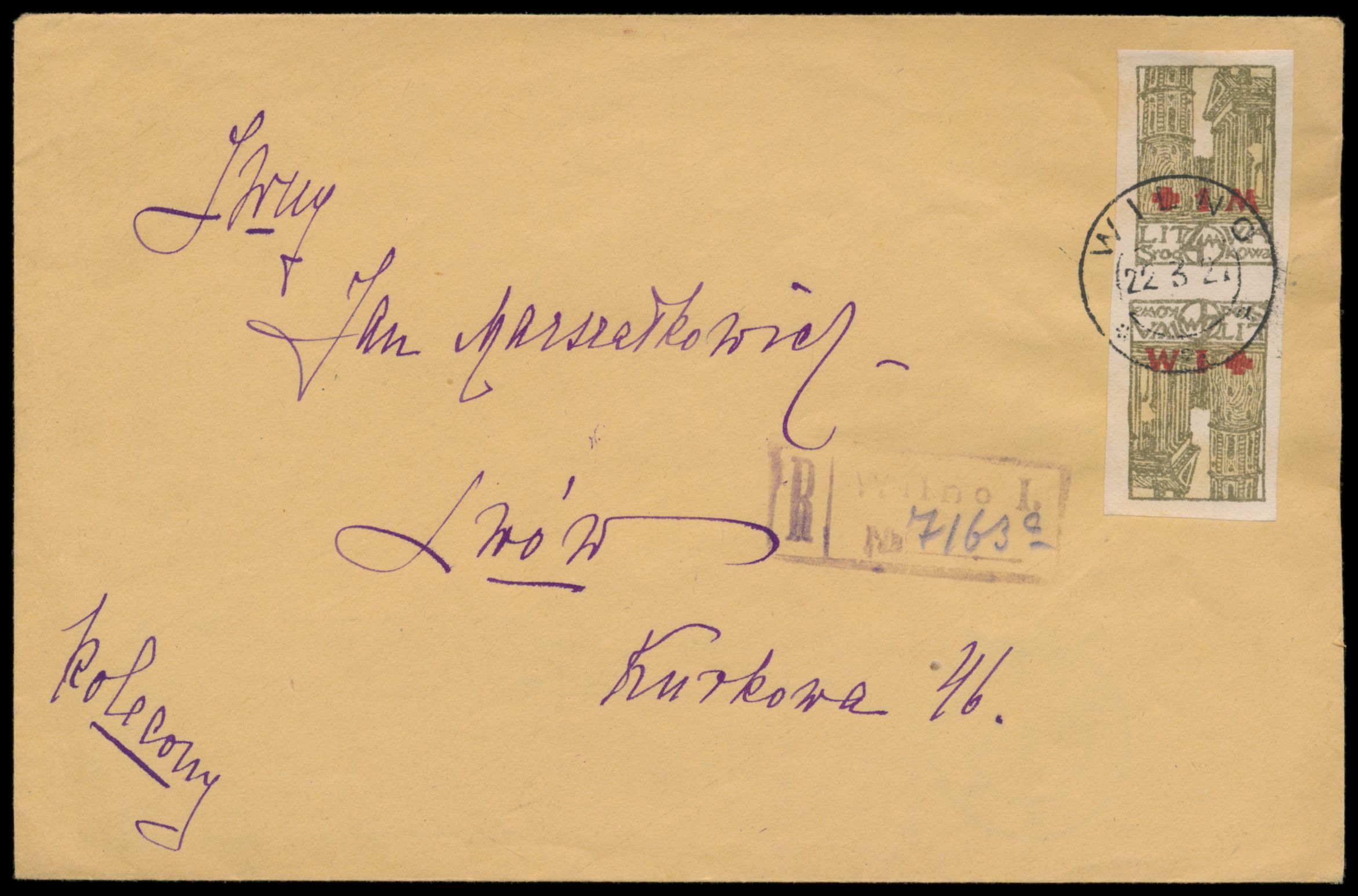 Mittellitauen, Zuschlagsmarke zugunsten des Polnischen Roten Kreuz 4 M. + 1 M. als senkrechtes ungezähntes Kehrdruckpaar auf Einschreibbrief 2. Gewicht mit militärischer Absenderangabe und Formationsstempel nach Lwow, Stempel Wilno 22.3.21, R-Stempel Wilno mit handschriftlicher Nr., portorichtig