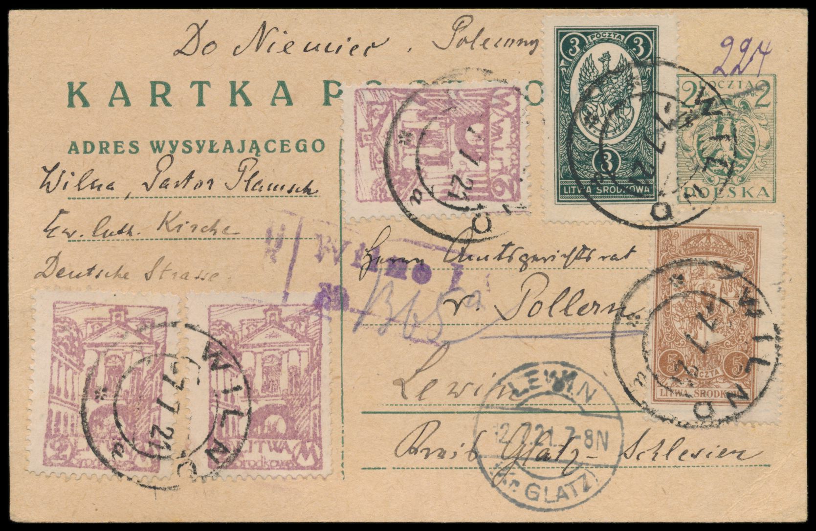 Mittellitauen, Polen-Ganzsache 2 M. (Formblattverwendung) mit Zusatzfrankatur Mittellitauen 3 x 2 M., 3 M. und 5 M. als Einschreiben nach Deutschland, Stempel Wilno 7.7.21, violetter R-Stempel mit handschriftlicher Nr., Ankunftsstempel Lewin (Kr. Glatz) 12.7.21, portorichtig 14 M., rückseitig mit kurzer Mitteilung
