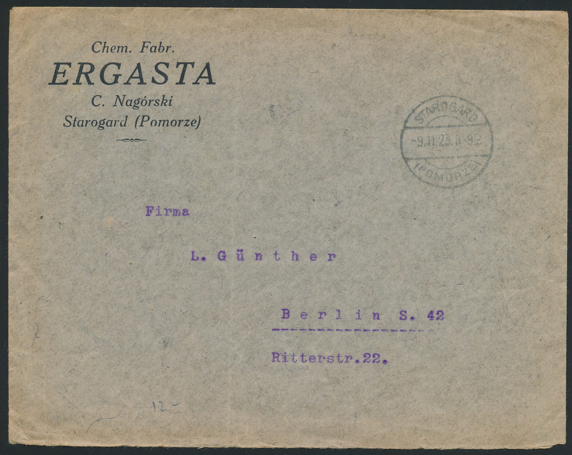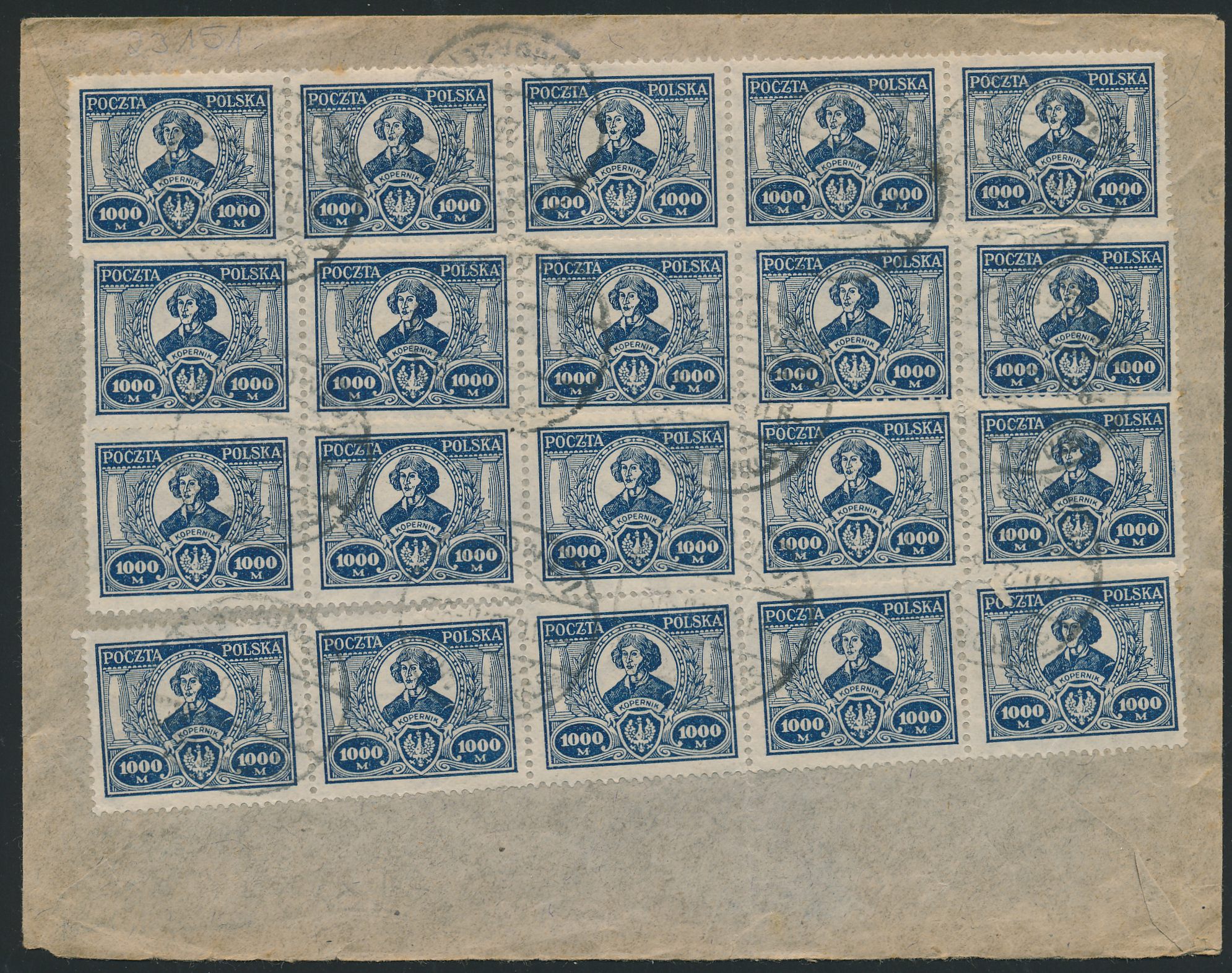 20 x 1.000 M. Kopernikus rückseitig auf Auslandsbrief nach Berlin, Stempel Starogard (Pomorze) 9.11.23, portorichtig, Bedarf
