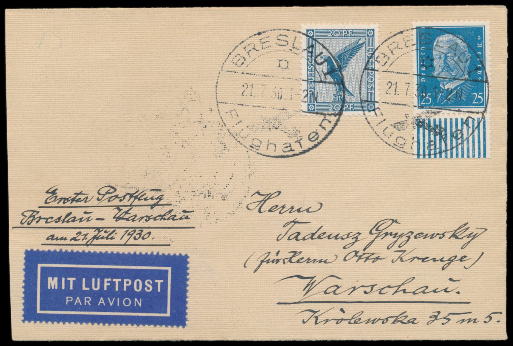 Erstflug Breslau - Warszawa 21.7.1930, Brief mit Dt. Reich 20 Pf. und 25 Pf., Stempel Breslau Flughafen 21.7.30, Ankunftstempel Warszawa 19 Port Lotniczy 21.7.1930, Fischer Nr. 104c, 87 Sendungen befördert