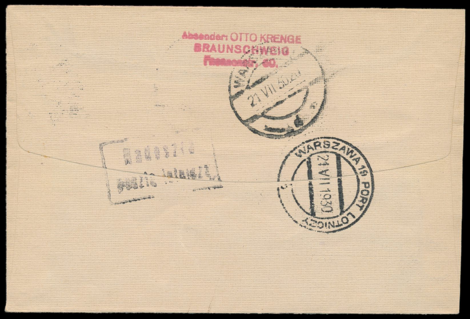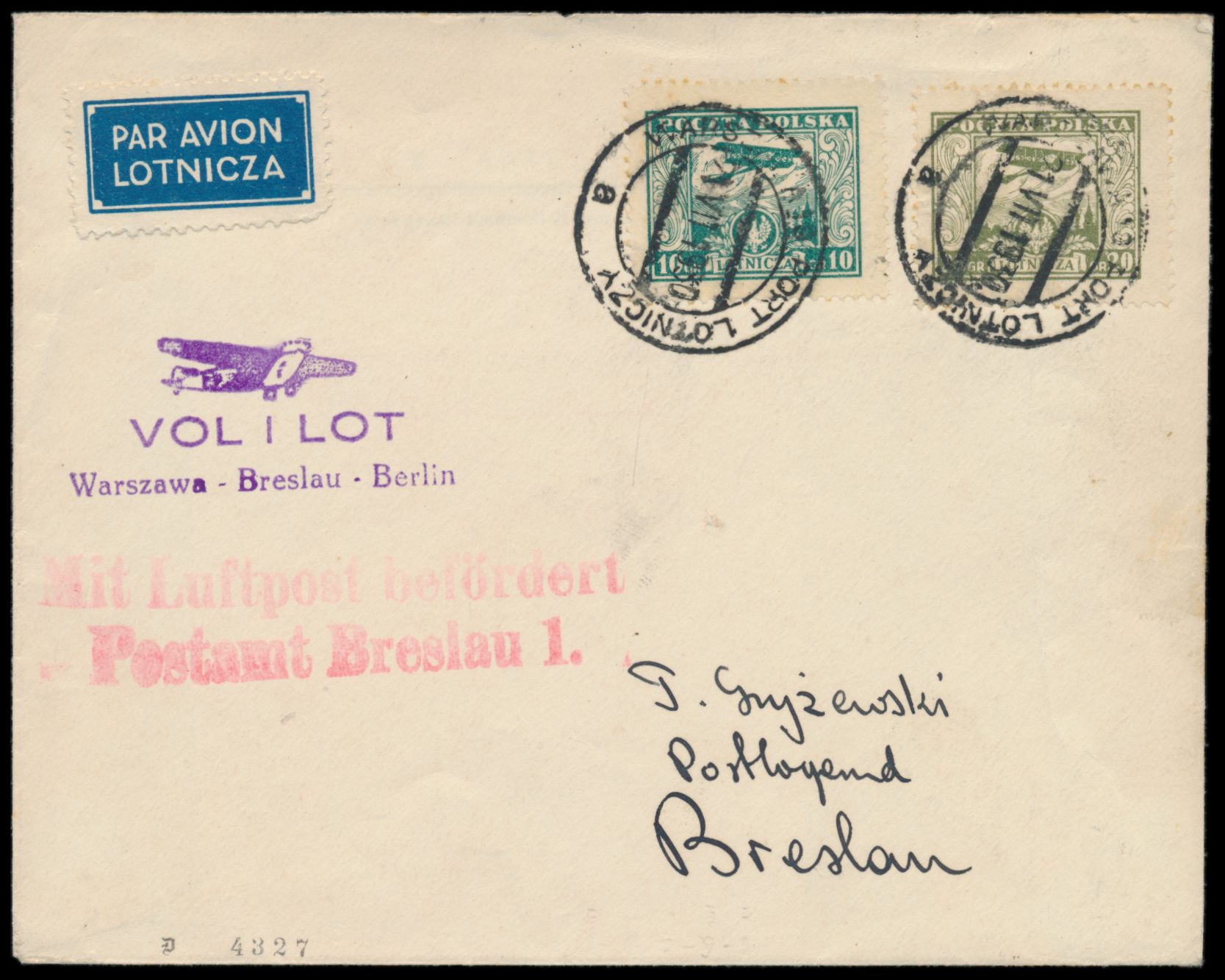 Erstflug Warszawa - Breslau 21.7.1930, Brief mit 16 Gr. und 20 Gr. Flugpost, Stempel Warszawa 19 Port Lotniczy 21.7.1930, Bestätigungsstempel und roter L2 Mit Luftpost befördert / Postamt Breslau, Fischer Nr. 104a, 141 Sendungen befördert