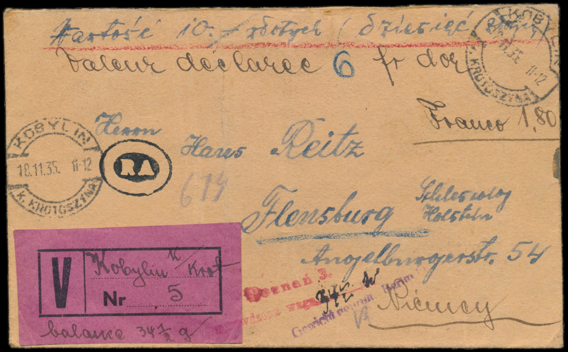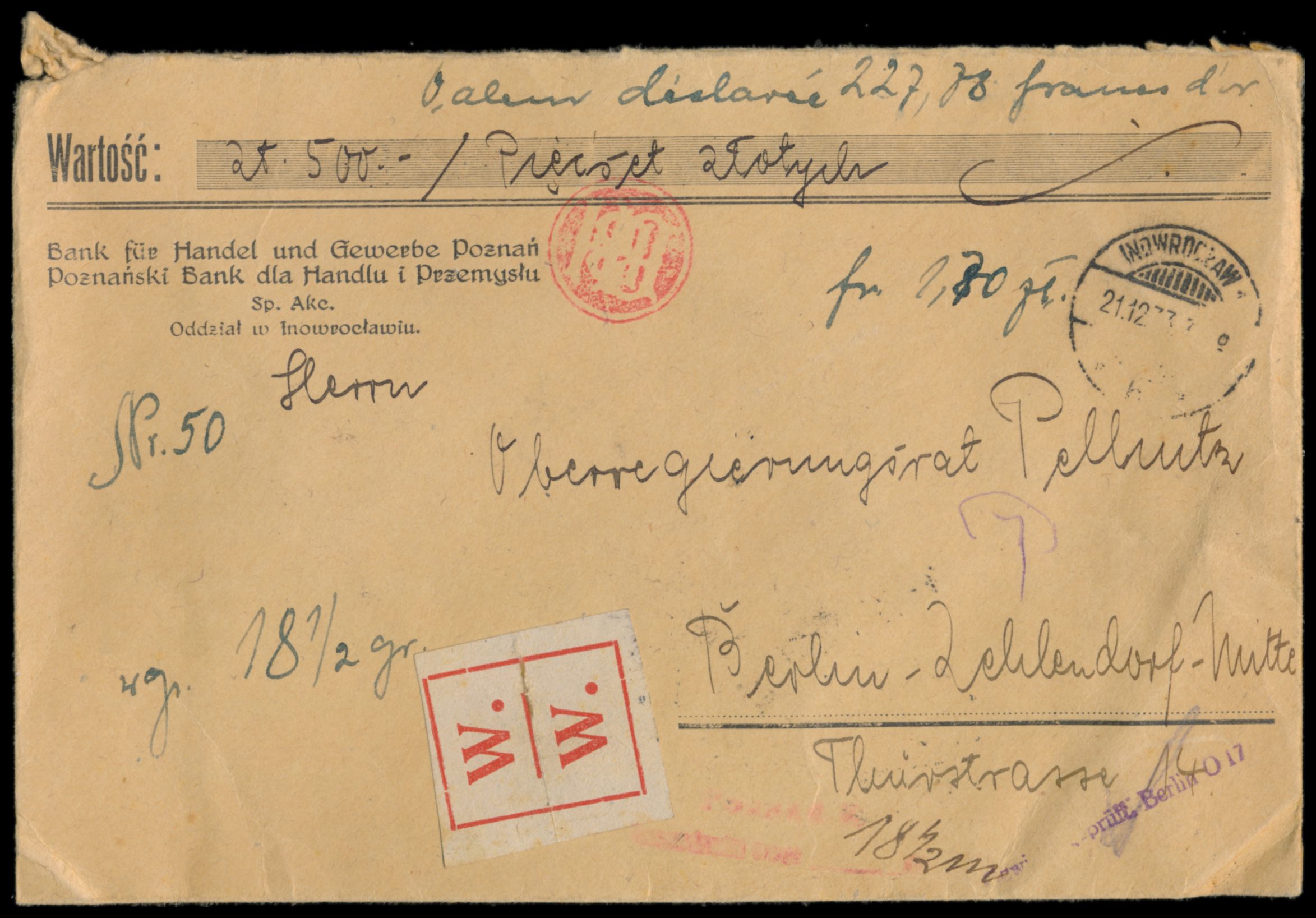 Wertbrief nach Deutschland, Wertangabe "28.500 Zl. / 227 Francs d´or", Porto 2,70 Zl. bar bezahlt, Stempel Inowrozlaw 21.12.33, W.-Zettel, Durchgangsstempel Poznan 22.12.33, kleiner L1 "Gewicht geprüft. Berlin O 17", Ankunftstempel Berlin-Zehlendorf 22.12.33