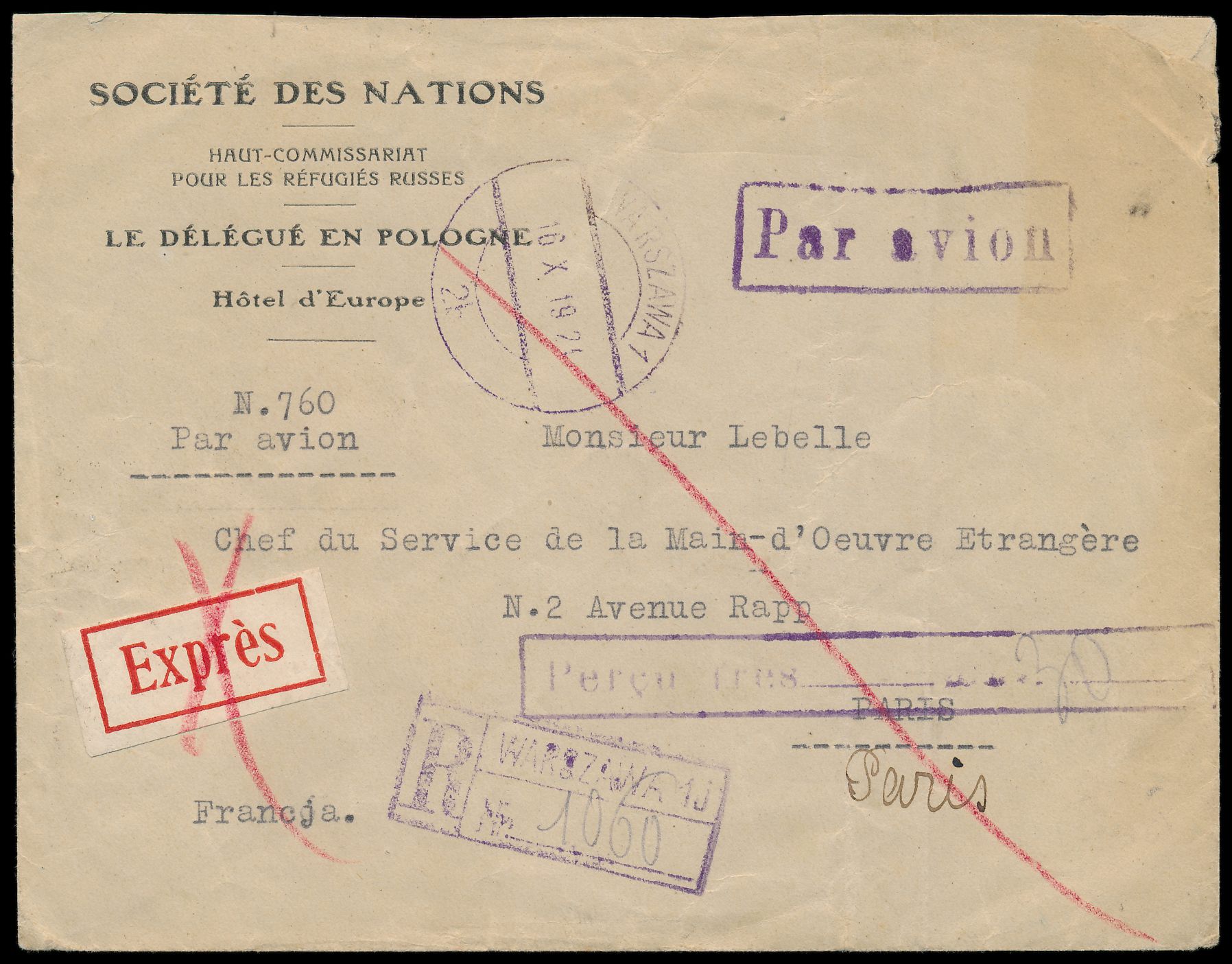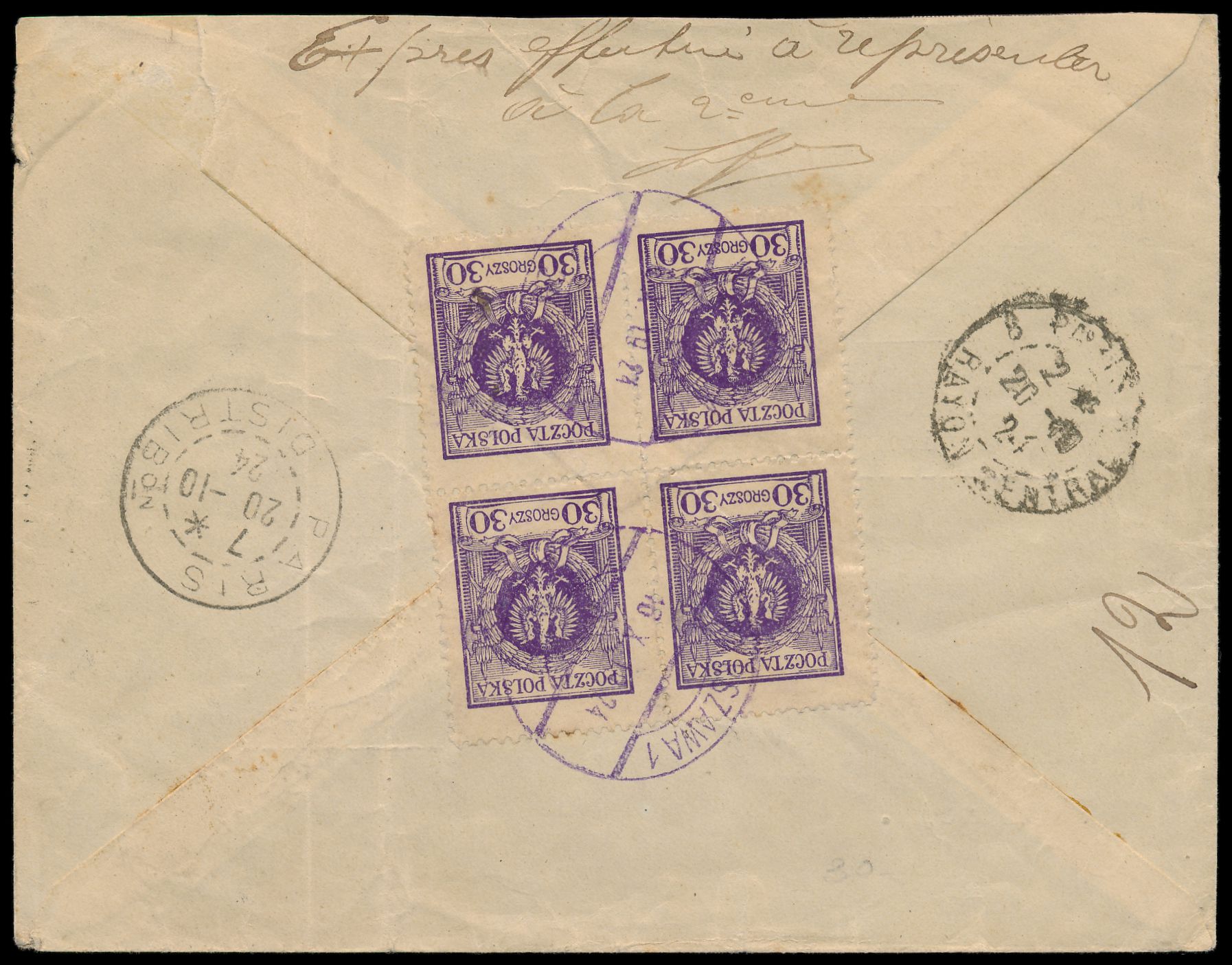 Viererblock 30 gr rückseitig auf Luftpost-Express-R-Brief von Warszawa 16.10.1924 nach Paris, Luftpostzuschlag bar bezahlt, violetter R1 "Percu frcs ....", vorderseitig gedruckter Absender "Société des Nations - Haut-Commissariat pour les Réfugiés Russes ..." , Ankunftstempel Paris 20.10.24, portorichtig, zwei schwache senkrechte Büge, Bedarf