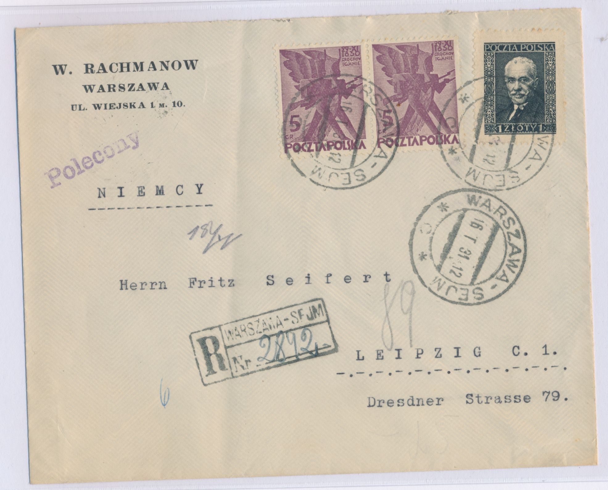 2 x 5 Gr. und 1 Zl. auf Einschreibbrief mit Stempel Warszawa-Sejm 16.1.31 und R-Stempel nach Deutschland, gelber Devisenkontrollzettel, Ankunftstempel Leipzig 17.1.31, links schwacher senkrechter Bug