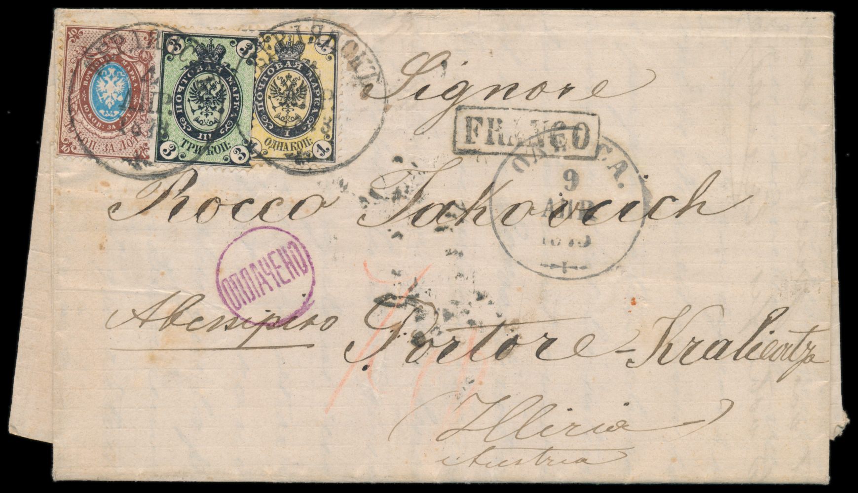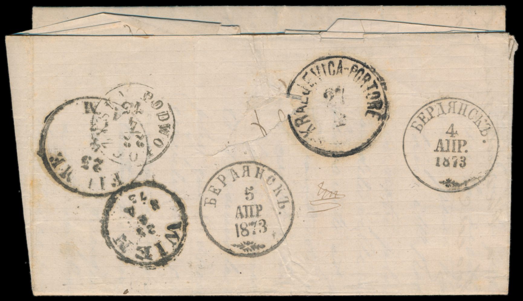 Ausgabe 1866: 1 Kop., 3 Kop. (senkrecht gestreiftes Papier) und 10 Kop. mit Stempel Berdiansk 4.4.1873 auf Faltbrief nach Österreich, Stempel Franco, Durchgangsstempel Odessa, Wien und Fiume, Ankunftstempel Kraljevica-Portore 27.4.(1873), mit komplettem Inhalt