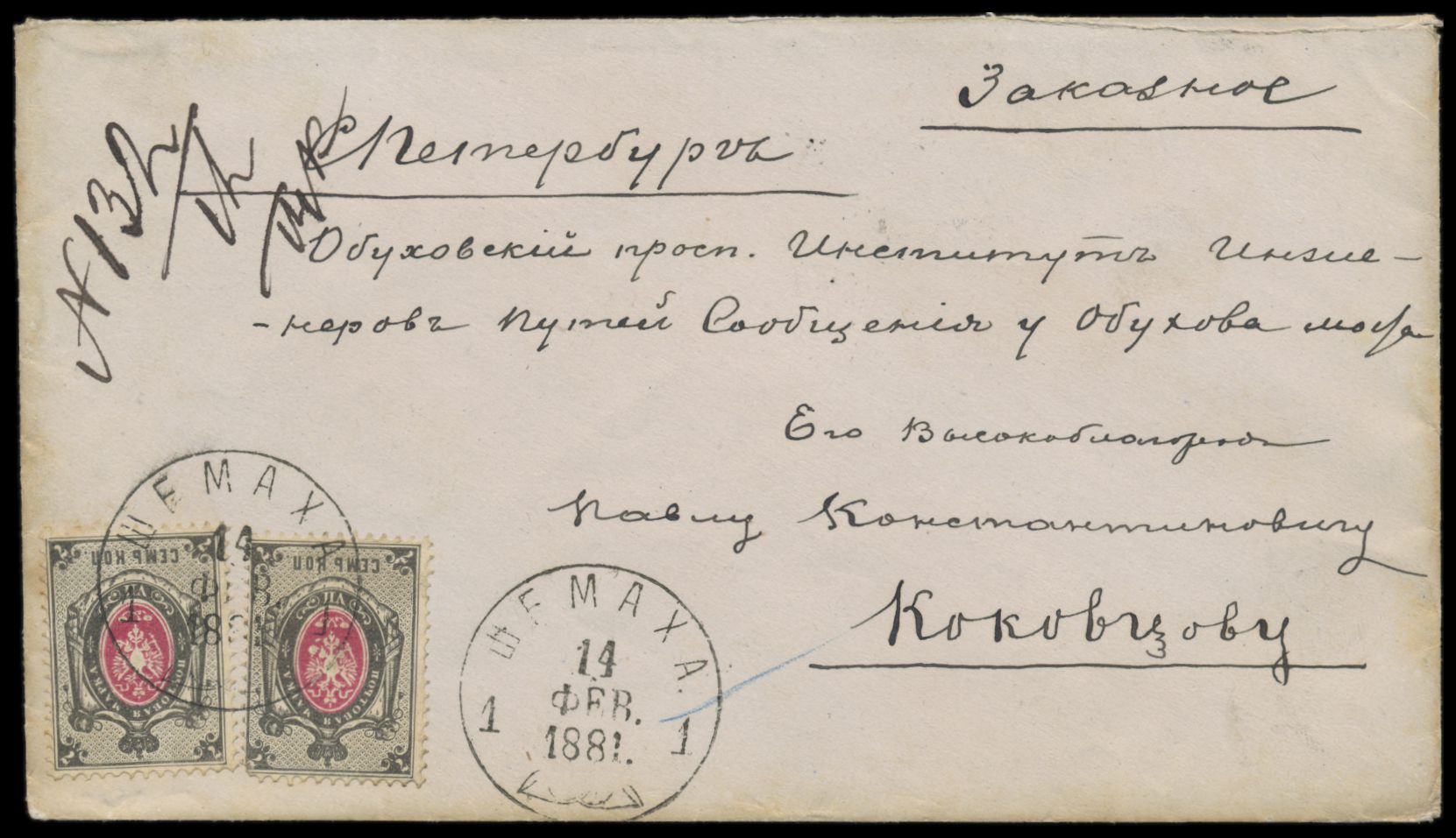 Aserbaidschan, 2 x 7 Kop. (eine Marke winziger Zahnfehler) auf Einschreibbrief mit Stempel Schemacha 14.2.81 nach St. Petersburg, handschriftlicher Registriervermerk, Ankunftstempel St. Petersburg 26.2.1881