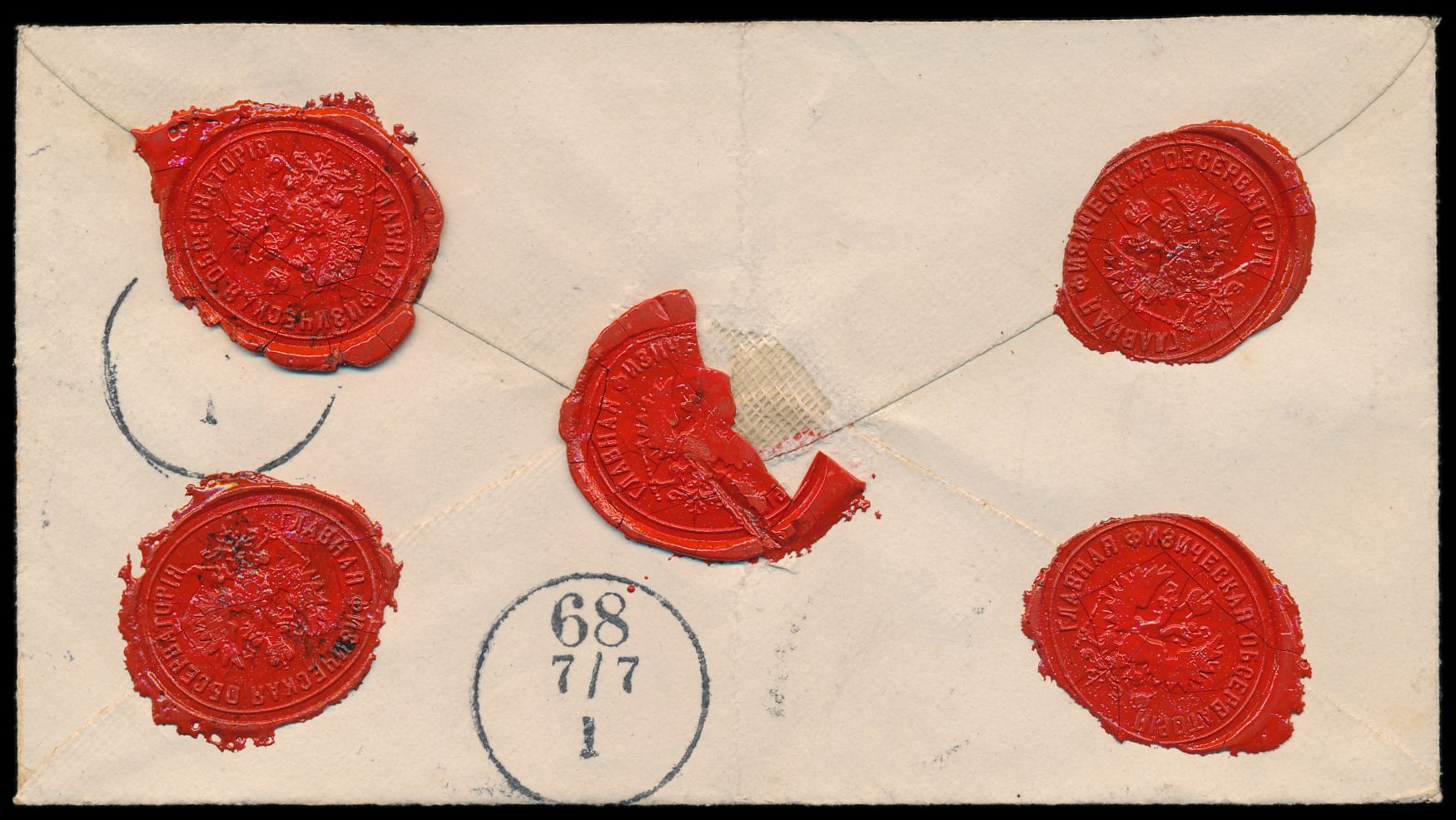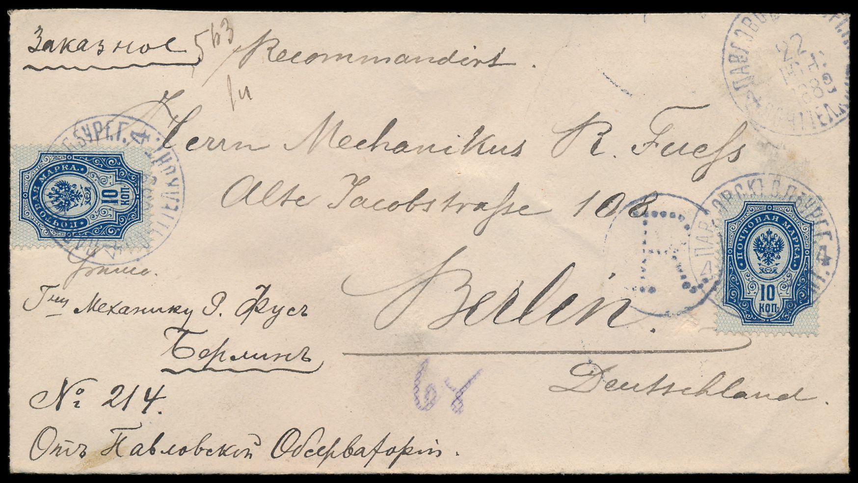 2 x 10 Kop. auf Einschreibbrief mit Stempel Pawlowsk S. P.burg G. 22.6.1882 nach Berlin, handschriftlicher Registriervermerk, rückseitig 5 Lacksiegel des Physikalischen Zentralobservatoriums, Ankunftstempel 7.7.(1882)