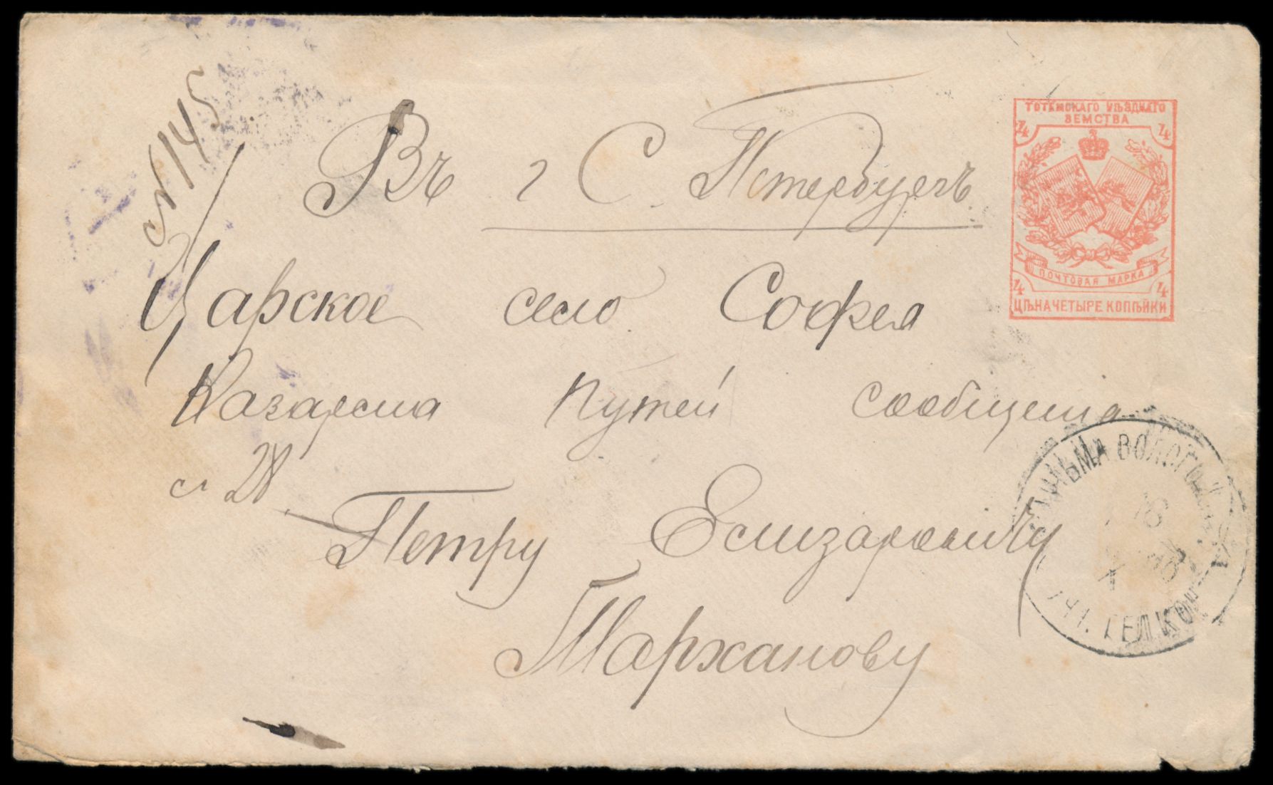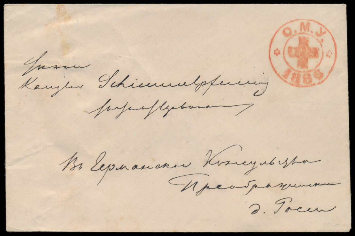 Ganzsachenumschlag der Gesellschaft vom Roten Kreuz in Odessa 1886 mit Anschrift, wie üblich ohne Poststempel