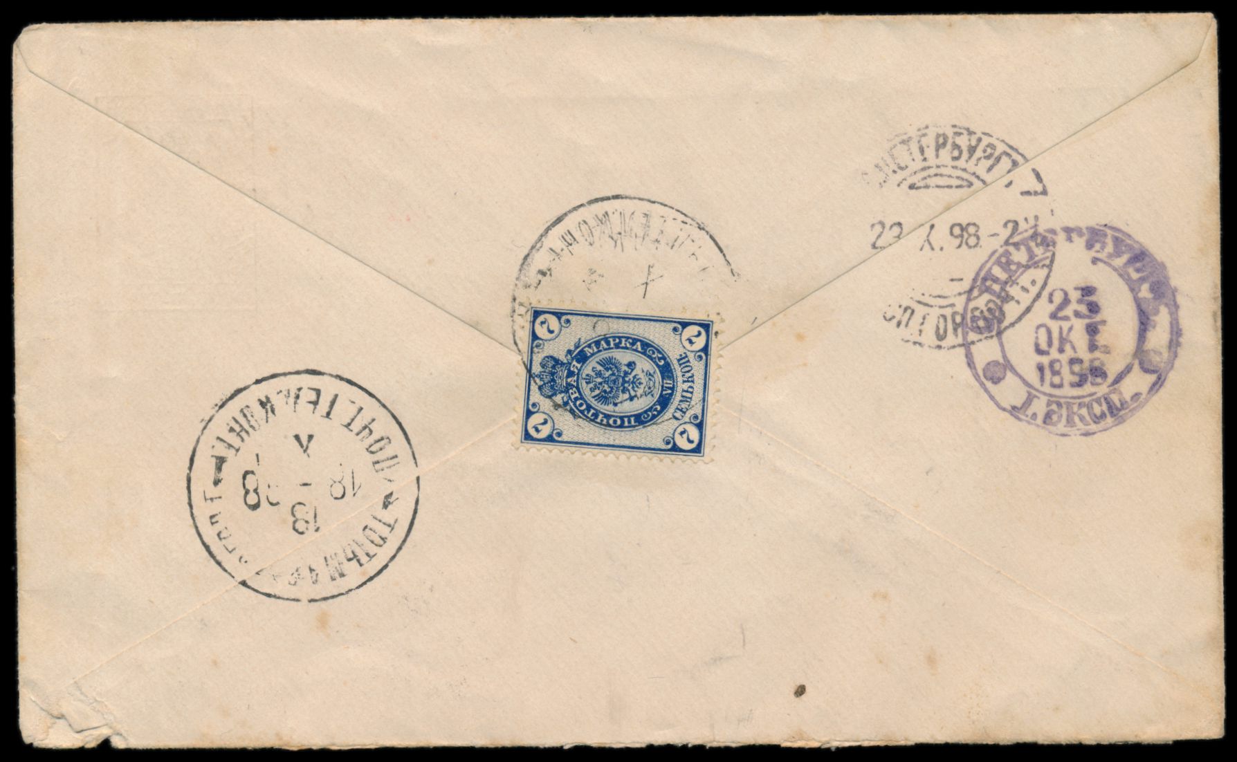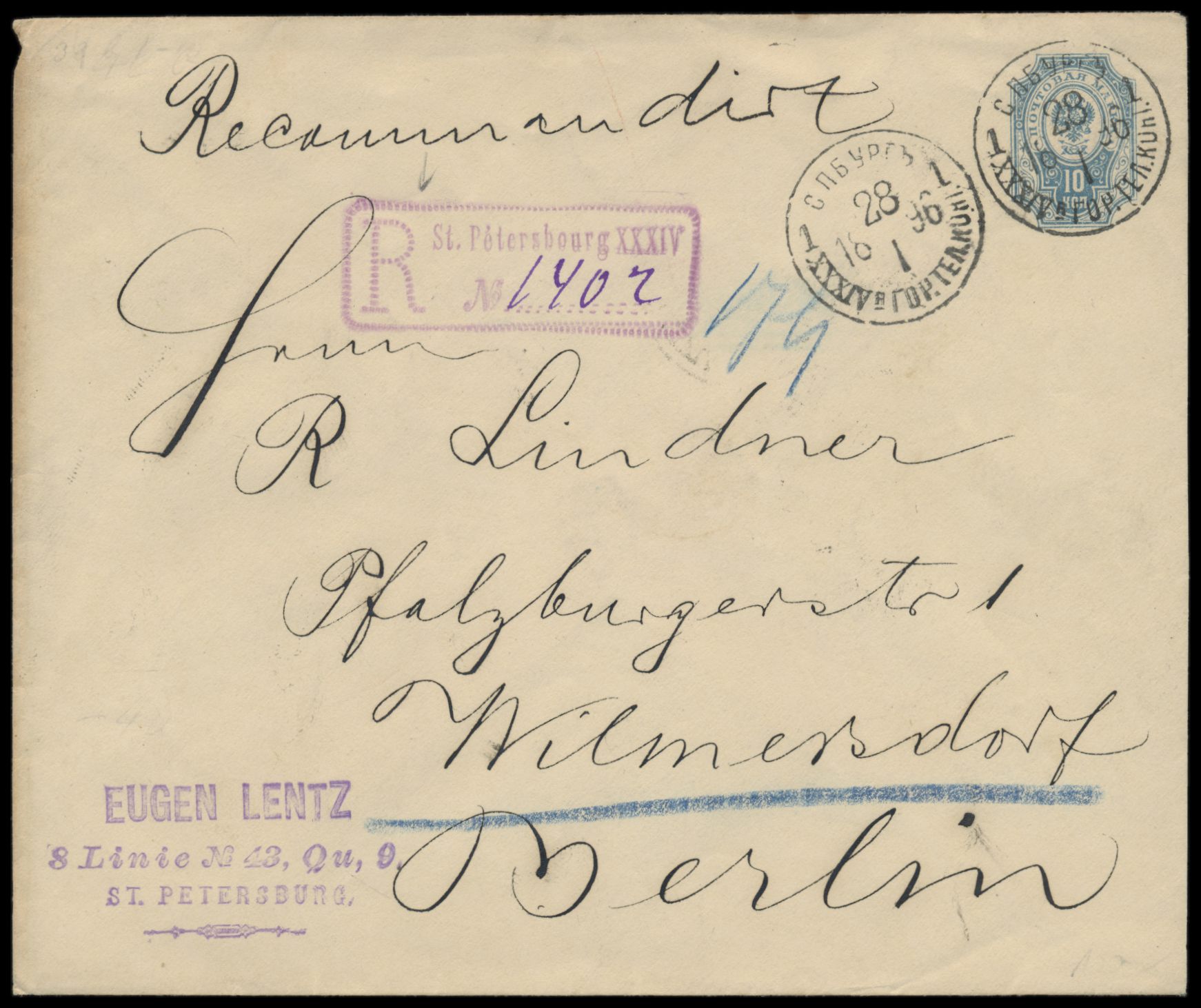Ganzsachenumschlag 10 Kop. (Großformat) mit rückseitiger Zusatzfrankatur 2 x 2 Kop. und 2 x 3 Kop. als Einschreiben nach Deutschland, Stempel St. Peterburg XXXIV. Städt. Tel. Kont. 28.1.1896, seltener violetter R-Stempel mit punktiertem Rahmen, Registriernummer handschriftlich, Ankunftstempel Wilmersdorf bei Berlin 12.2.96