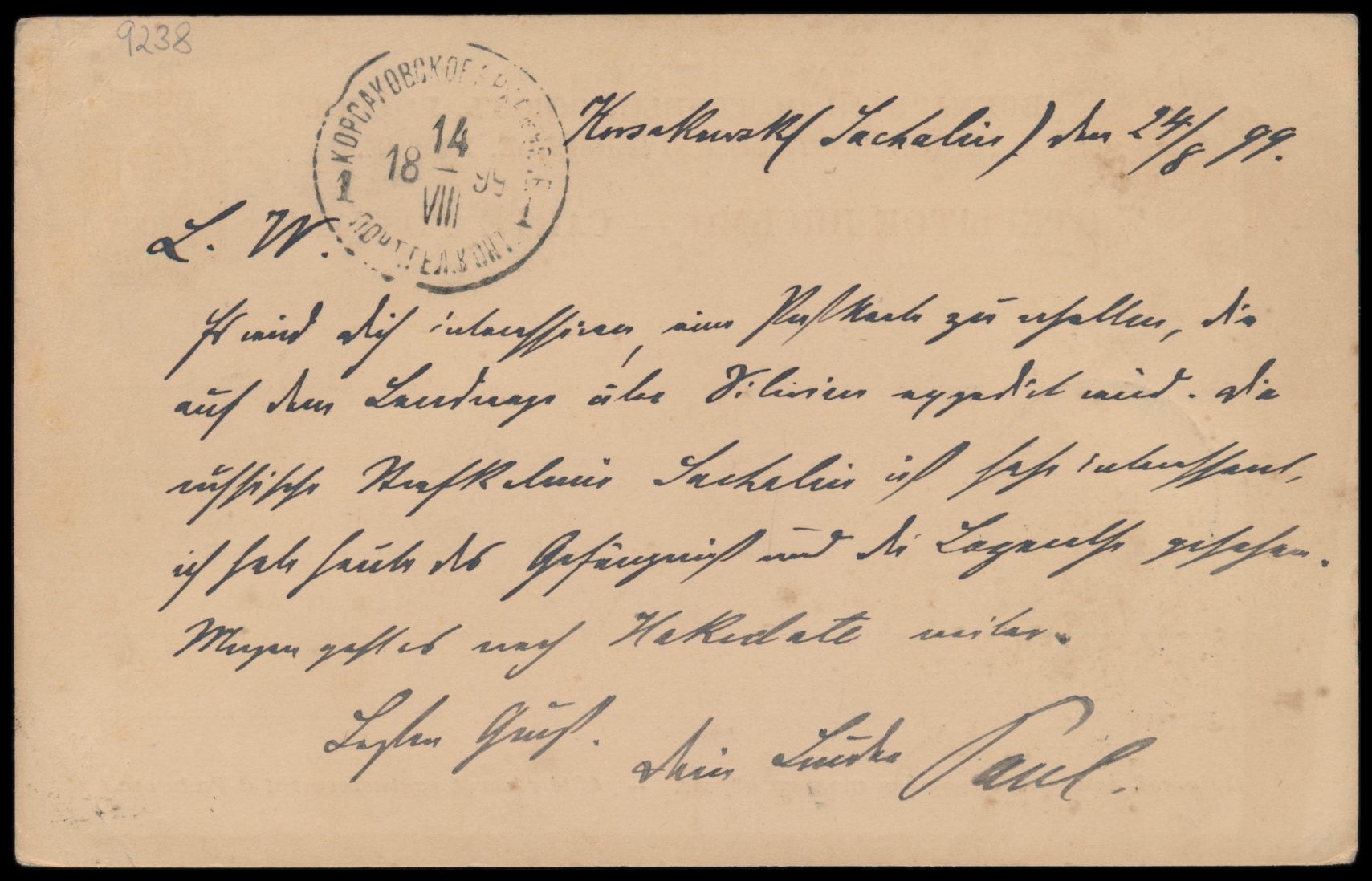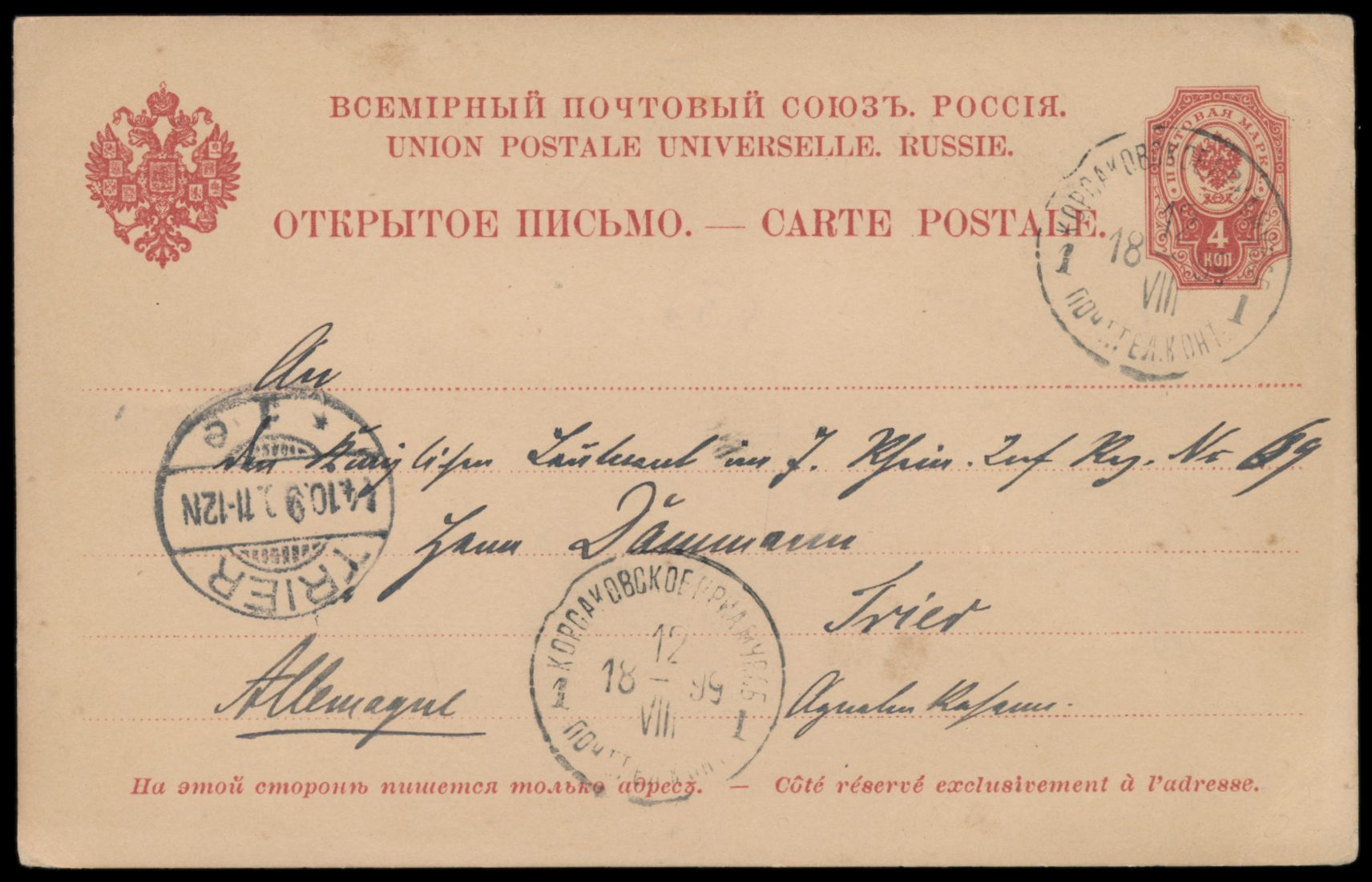 Sachalin, Ganzsache 4 Kop. mit Stempel Korsakowsk Priamur Obl. 12.8.1899 nach Deutschland, Ankunftstempel Trier 14.10.99, Bedarf, Text: "... Die russische Strafkolonie ist sehr interessant, ich sah heute das Gefängnis und das Lazareth gesehen. ..."