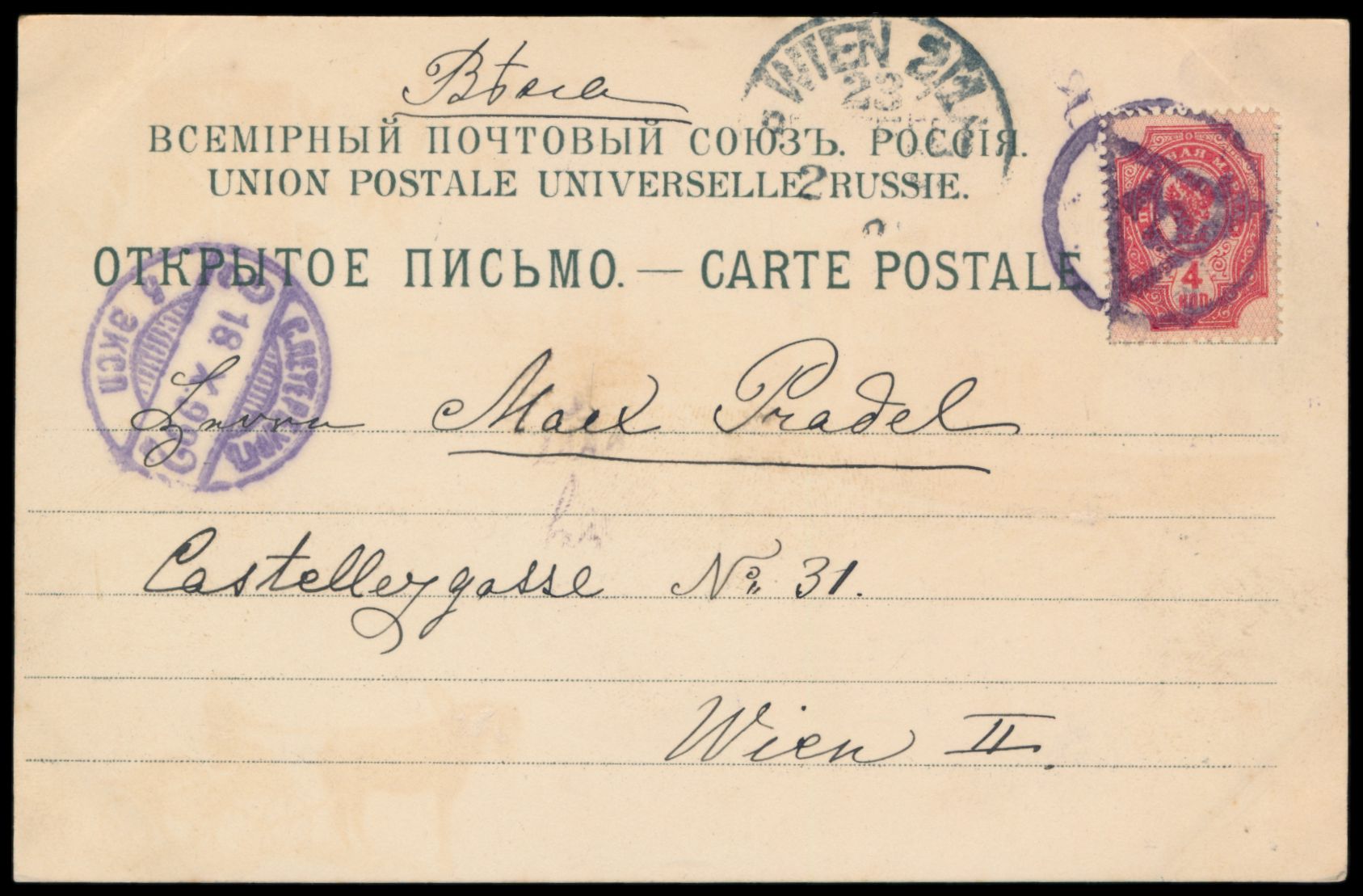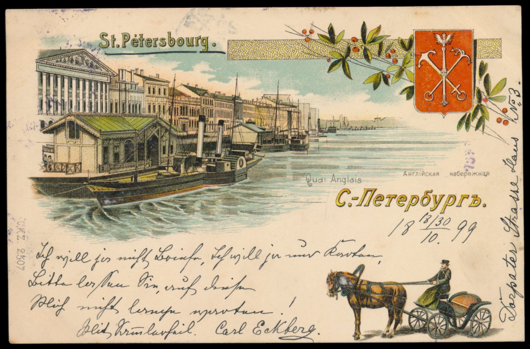 mehrfarbige Litho-Ansichtskarte St. Petersbourg - Quay Anglais, Frankatur 4 Kop., Nummernstempel 3 und Stempel St. Petersburg 18.10.99. nach Wien, Bedarf