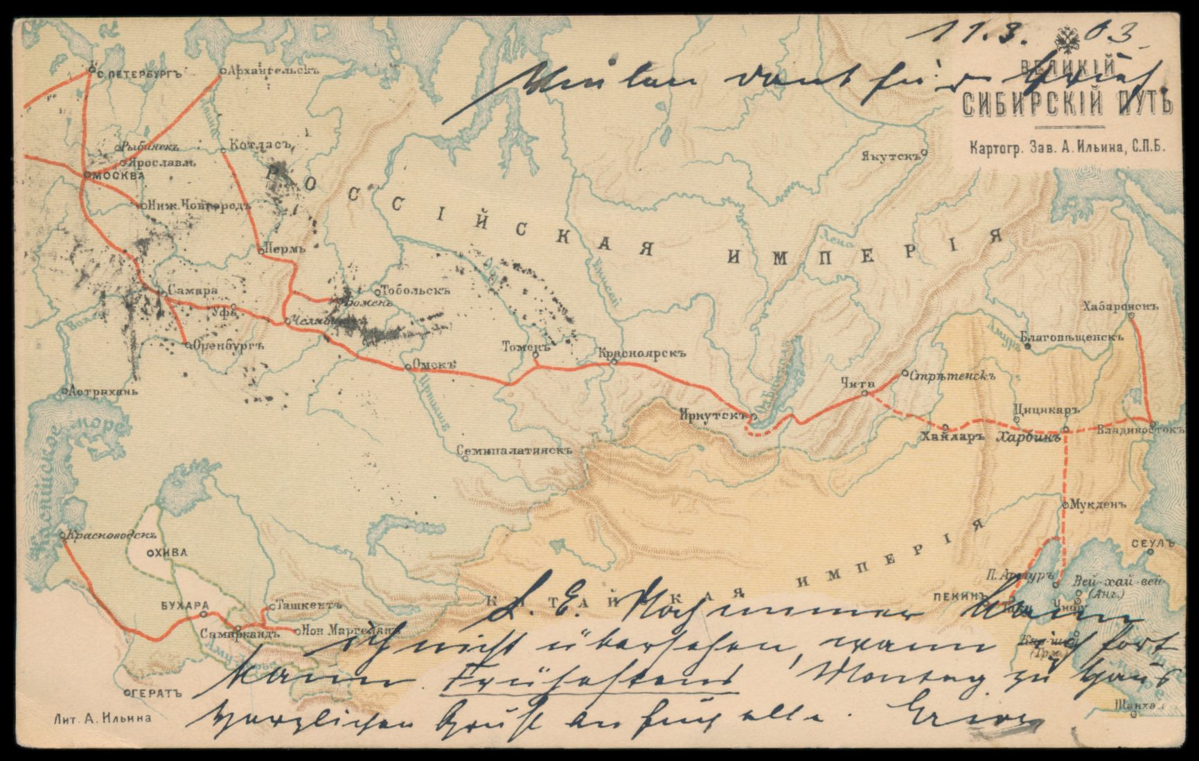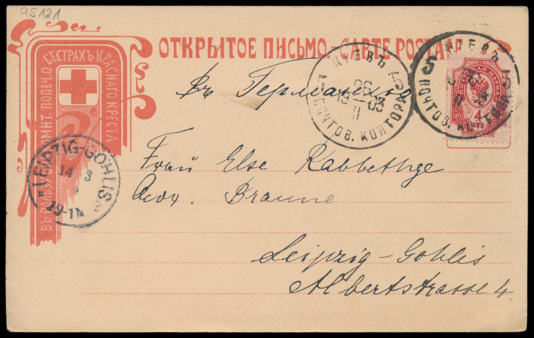 Ansichtskarte zugunsten des Roten Kreuzes mit Abbildung des Streckennetzes der Transsibirischen- und Ostchinesischen-Eisenbahn, Frankatur 4 Kop., Stempel Kiew 26.2.1903, nach Deutschland, Ankunftstempel Leipzig 14.3.03, Bedarf