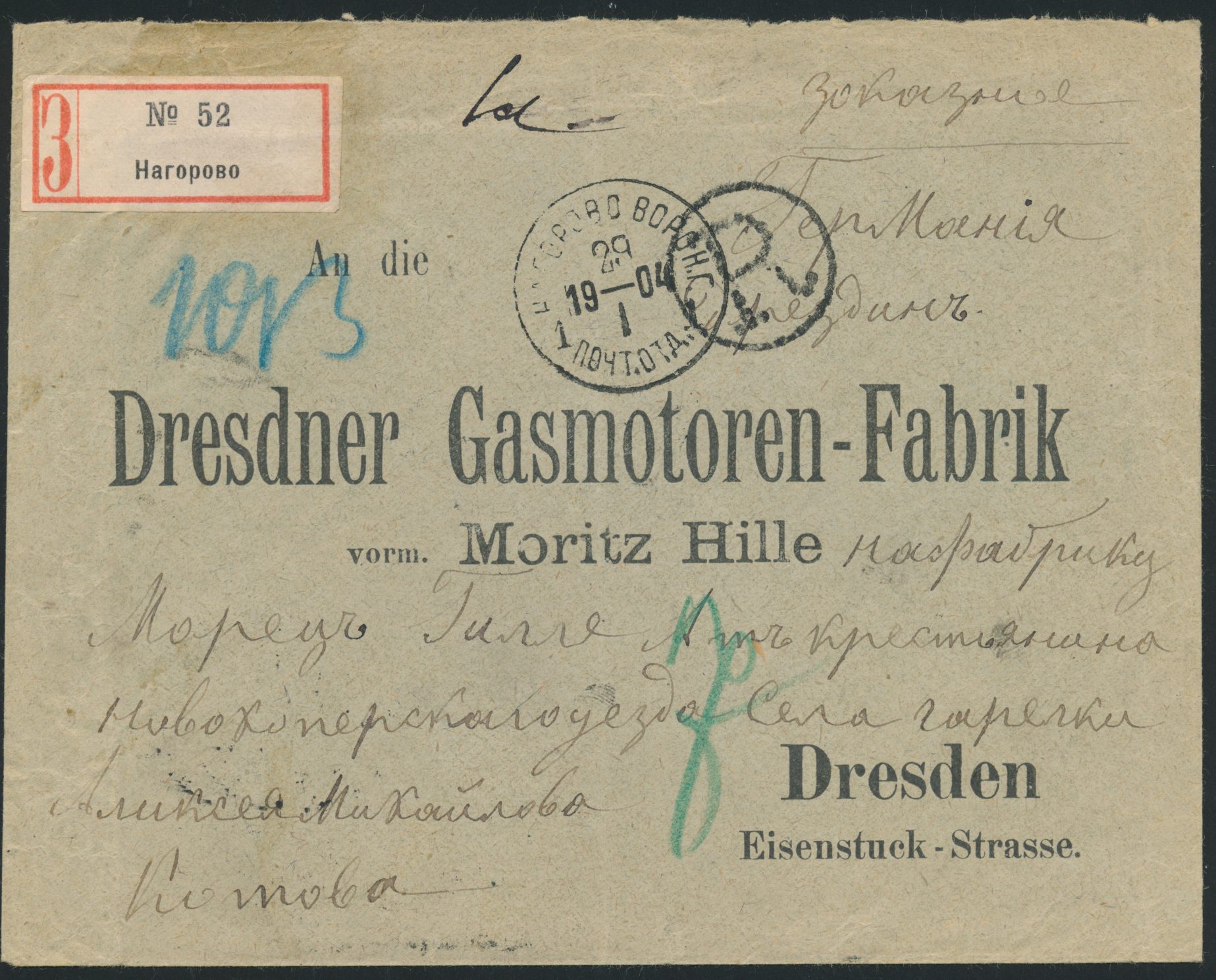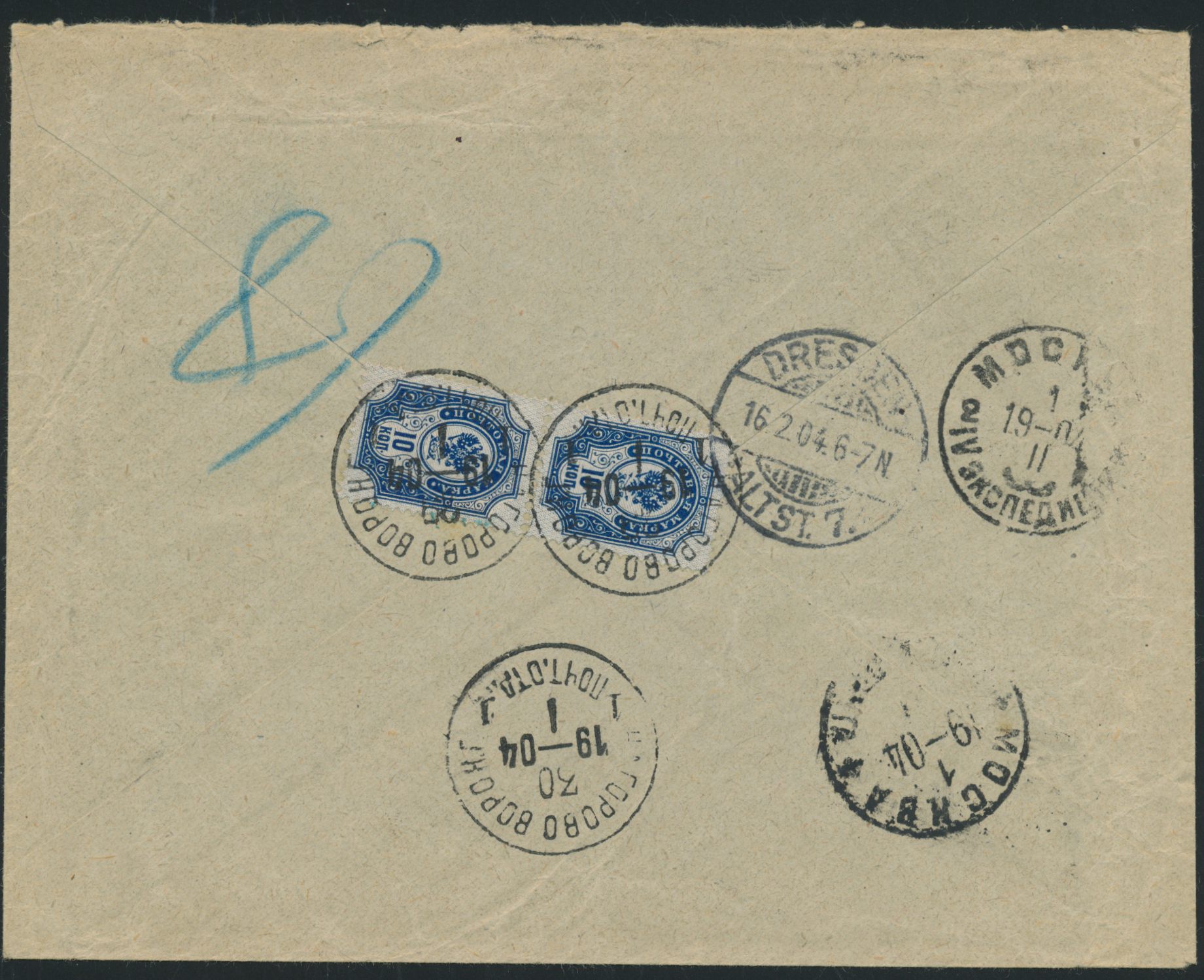 2 x 10 Kop. rückseitig auf Einschreibbrief mit Stempel Nagorowo Woron. G. 30.1.1904 nach Deutschland, ungezähnter 3-Zettel und Kreisstempel "R", Durchgangsstempel Moskau 1.2.1904, Ankunftstempel Dresden 16.2.04