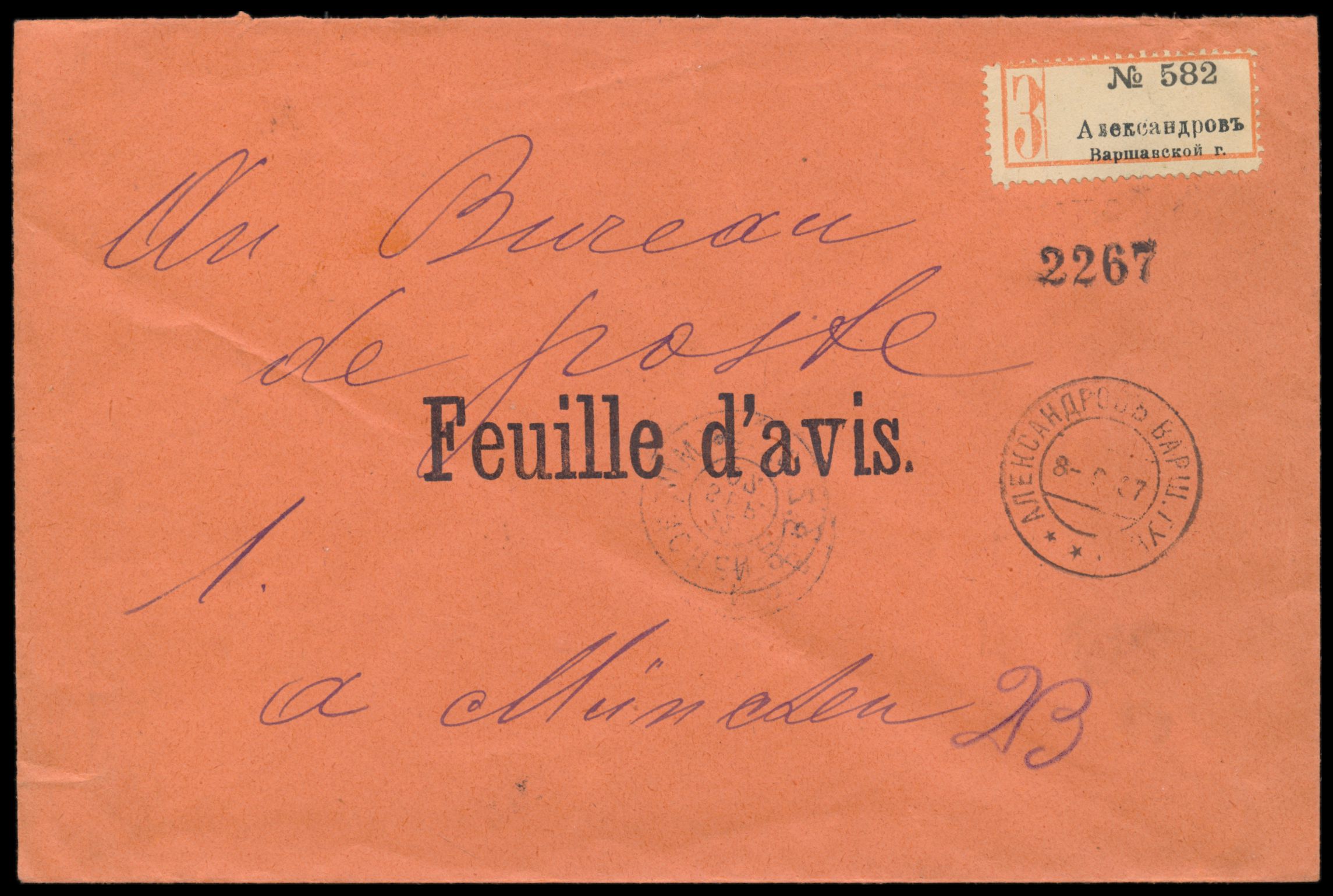 Einschreibbrief als portofreie Postsache (zurückgesandte Rückscheine) nach München, Stempel Aleksandrow Warsch. Gouv. 8.9.07, russischer 3-Zettel, Ankunftstempel 22.9.07