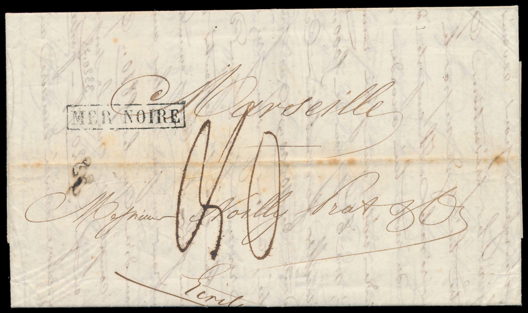 Krimkrieg 1854 - 1856, taxierter Faltbrief aus Kamiesch / Krim vom 3.11.1855 nach Marseille, schwarzer R1 Mer Noire, Durchgangsstempel des französischen Postamts Constantinople / Turquie 5.11.55 und Ankunftstempel Marseille 12.11.55, mit komplettem Inhalt. Kamiesch war Hafenplatz zur Versorgung der französischen Truppen auf der Krim