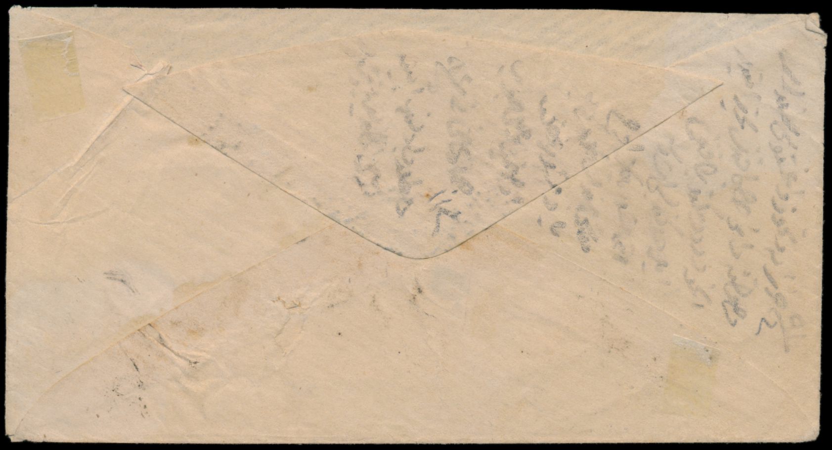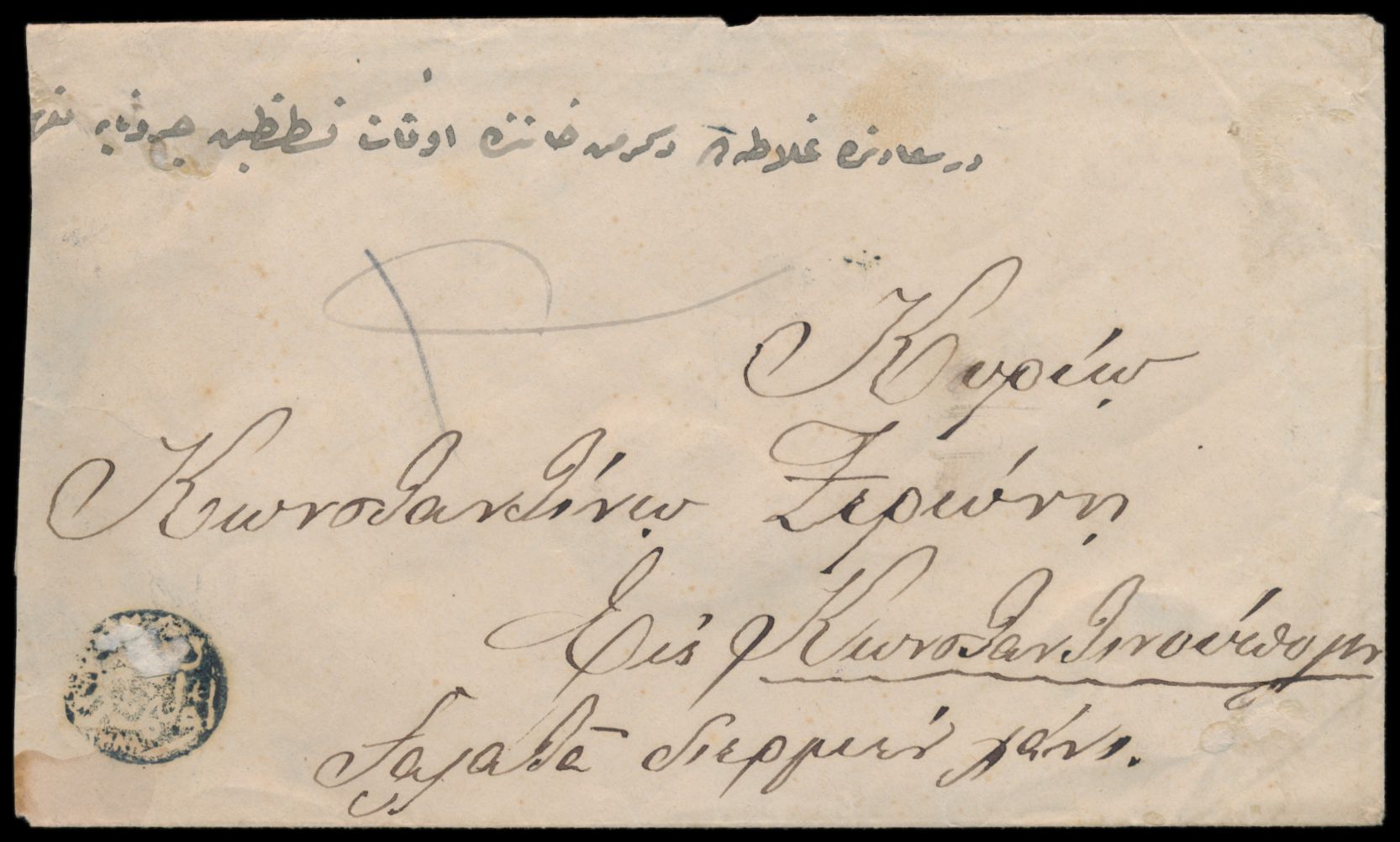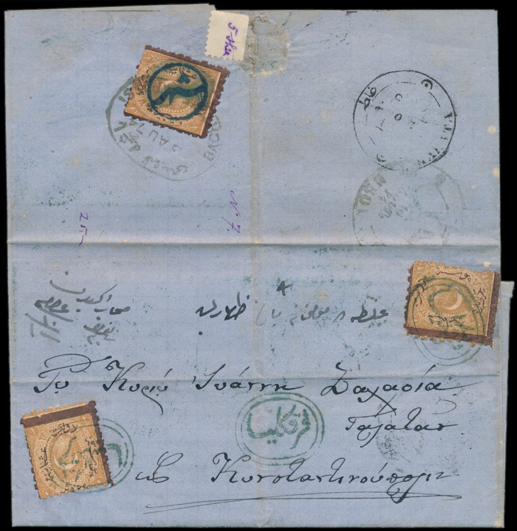 Duloz 1 Ghr braun (Portomarke) mit blauem Sehir-Aufdruck und Ovalstempel Baghtche Capussi 3.8.74 rückseitig auf Faltbrief, vorderseitig 2 x Duloz 1 Ghr (Portomarke) mit arabischem Doppelovalstempel von Kirk-Kilisse in blaugrüner Farbe, mit komplettem Inhalt in griechischer Sprache
