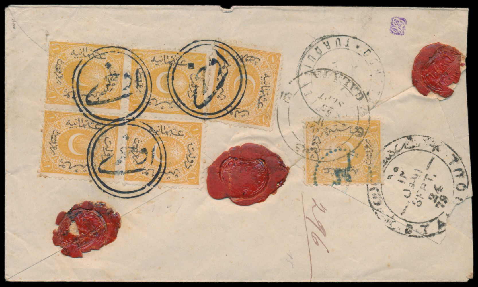 5 x Duloz 1 Ghr gelb mit arabischem Zweikreisstempel von Ohrid rückseitig auf Briefumschlag nach Konstantinopel, Ankunftstempel Stamboul 24.9.79, Duloz 1 Ghr. gelb mit blauem Sehir-Aufdruck frankiert, Stempel Galata 25.9.