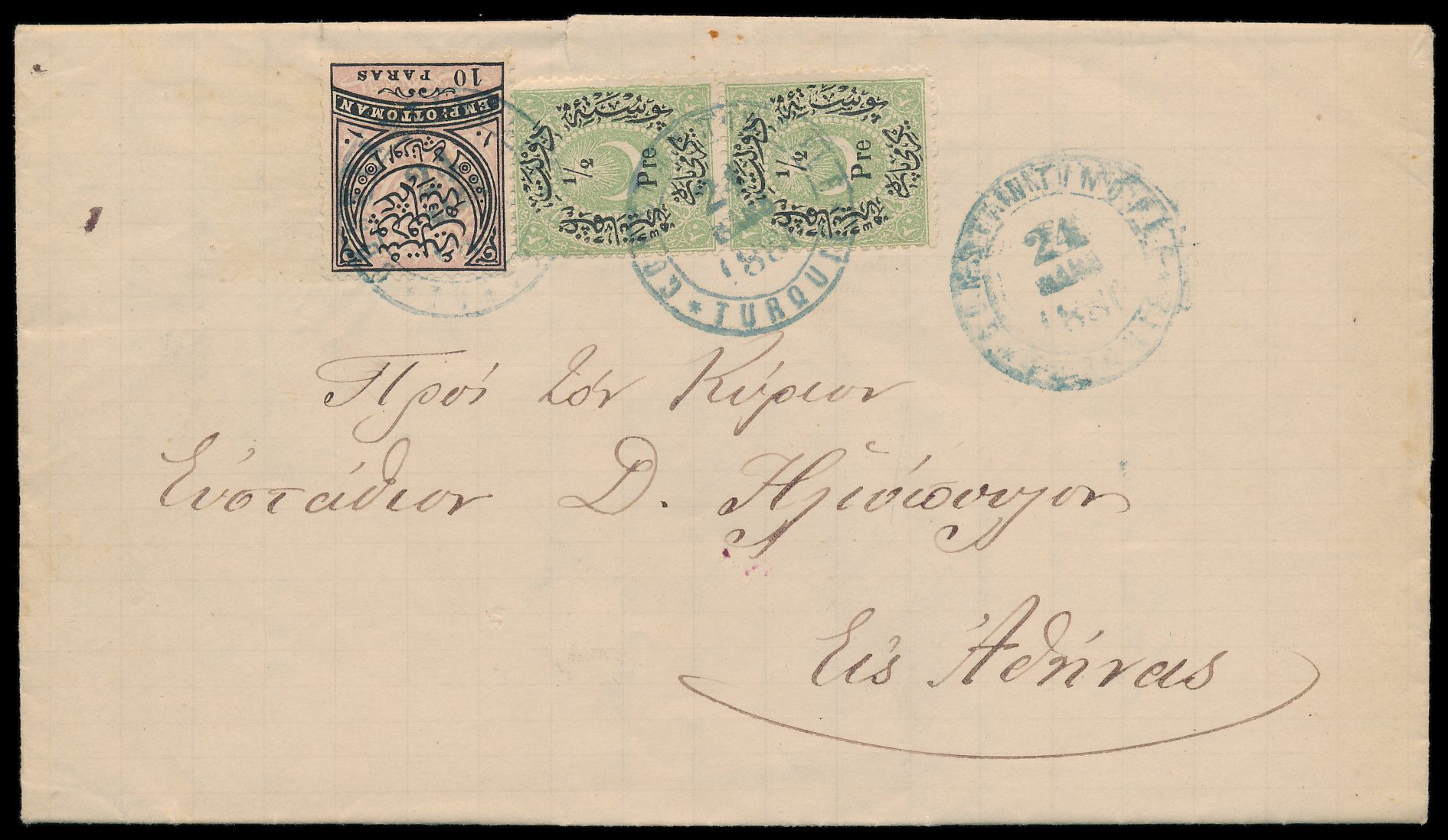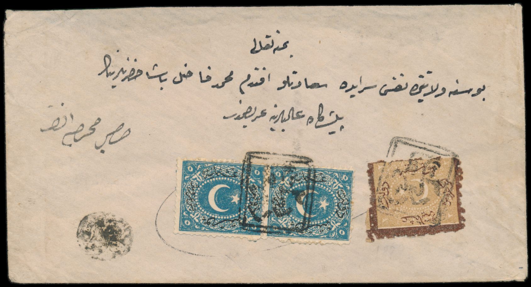 Duloz 2 Ghr und 2 x 5 Ghr auf Brief mit arabischem Stempel Dersaadet 2 (Istanbul Nr. 2)