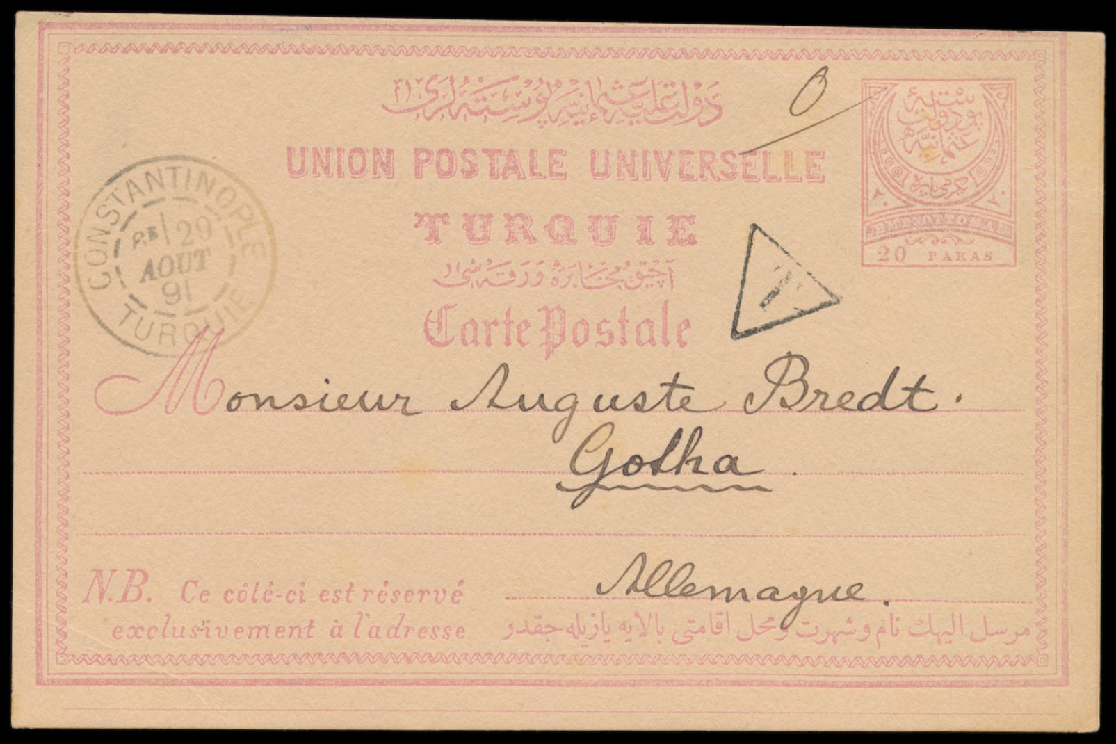 Türkei-Ganzsache 20 Pa. mit Stempel des französischen Postamts Constantinople / Turquie 20.8.91 nach Deutschland, französischer T-Stempel, Nachporto nicht erhoben, Bedarf