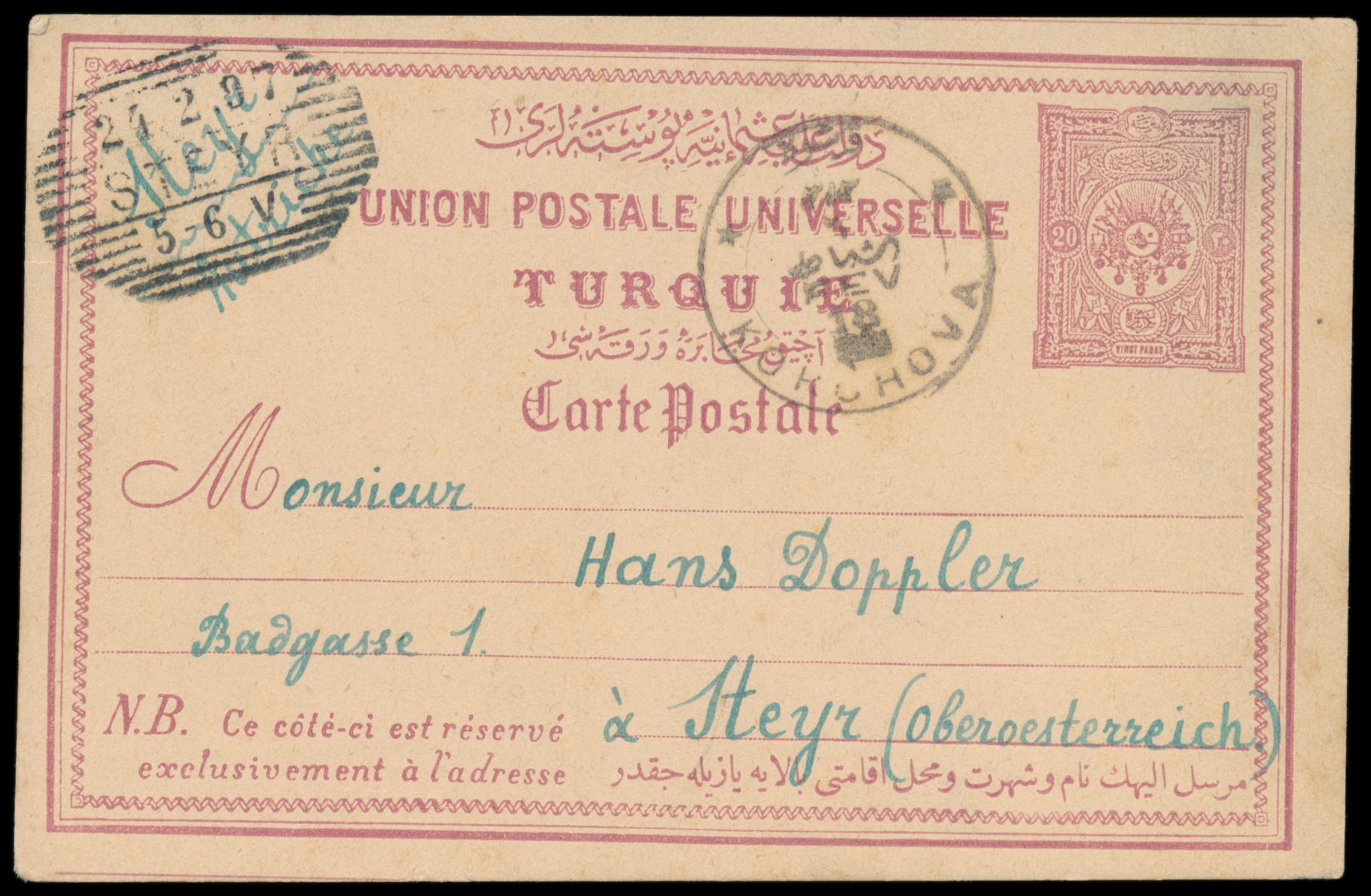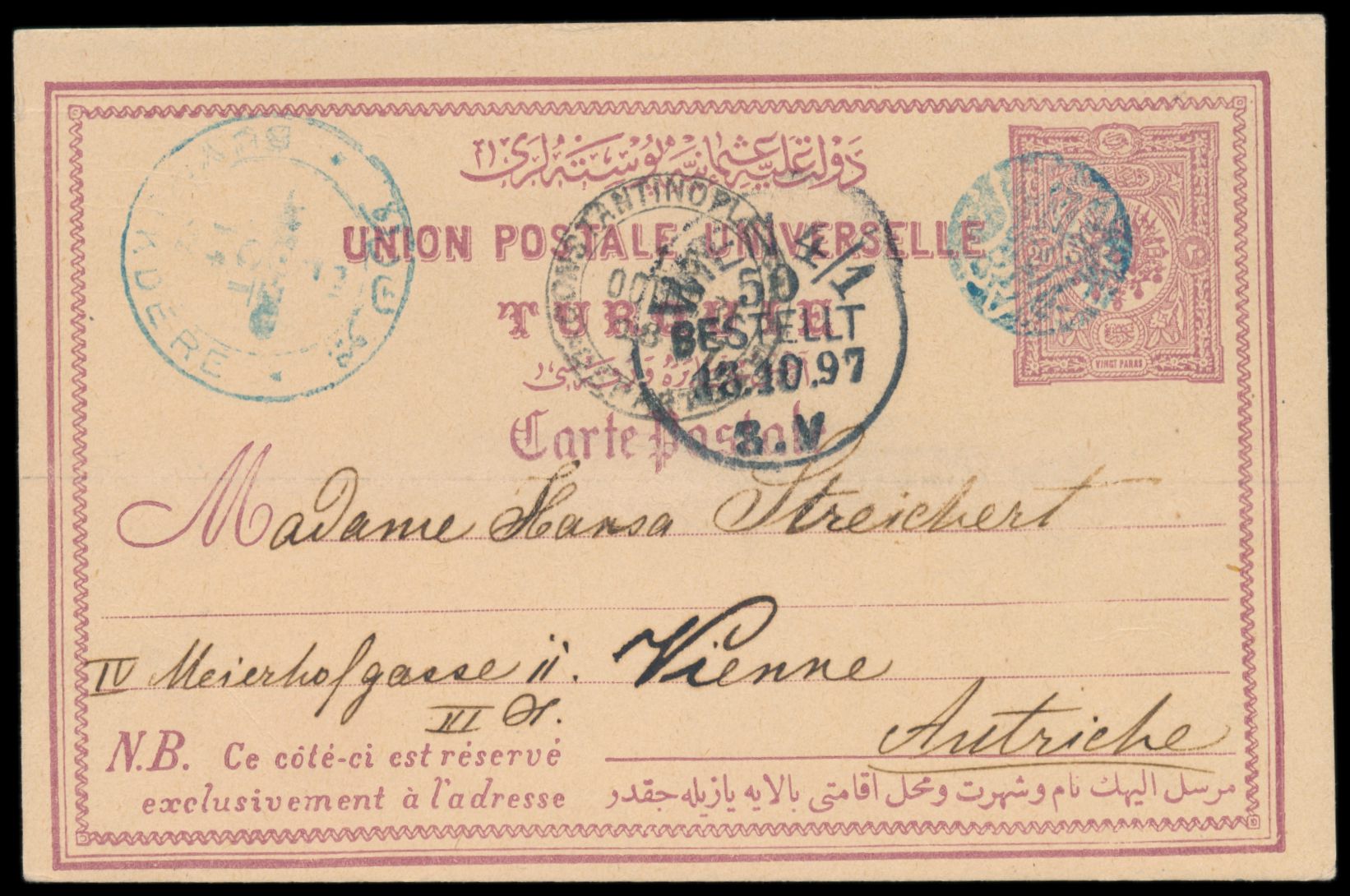 Ganzsache 20 Pa. mit arabischem Siegelstempel und Stempel Buyukdere 14.10.97, beide in blau, nach Wien, Durchgangsstempel Constantinople, Ankunftstempel 13.10.97
