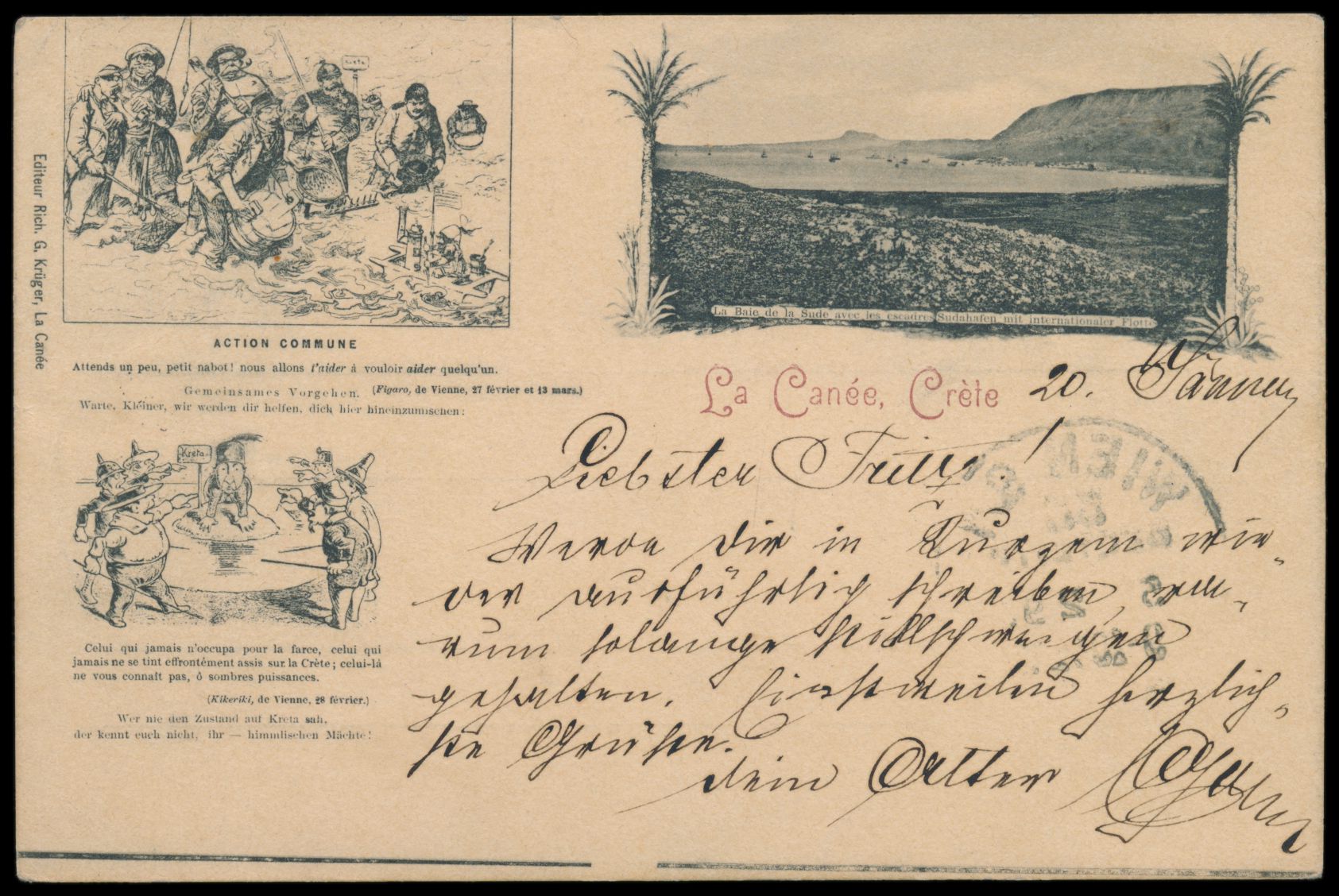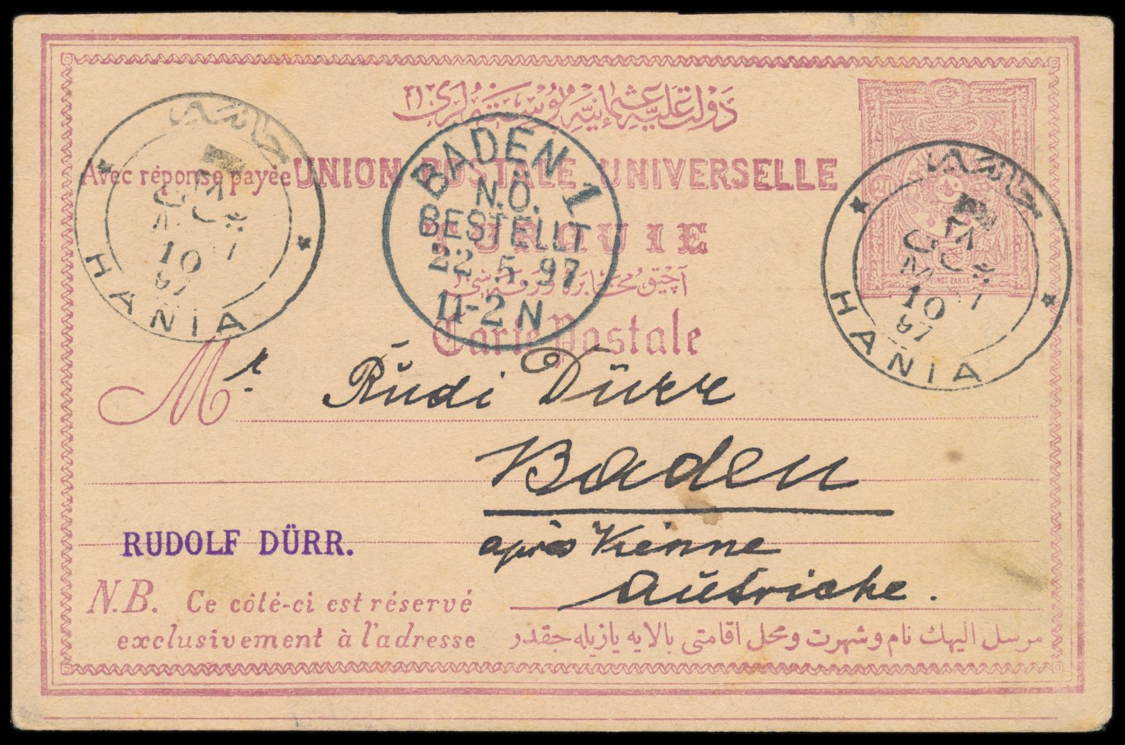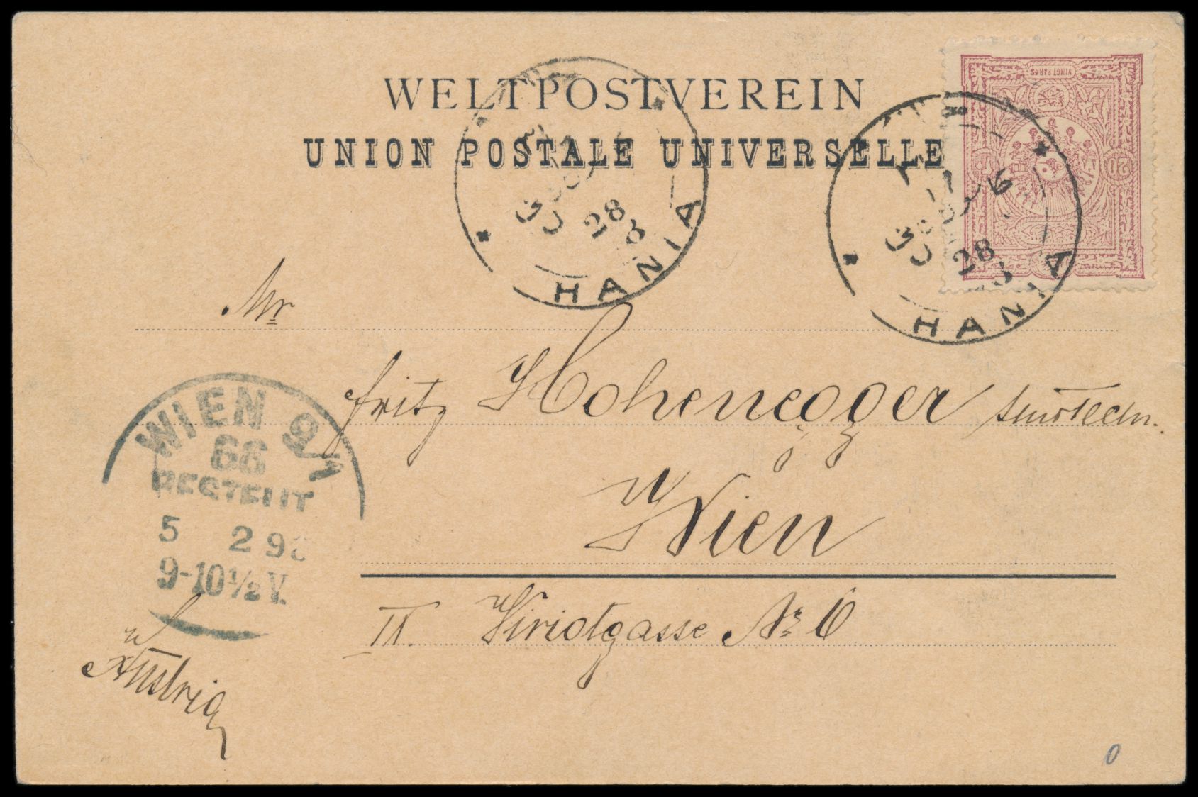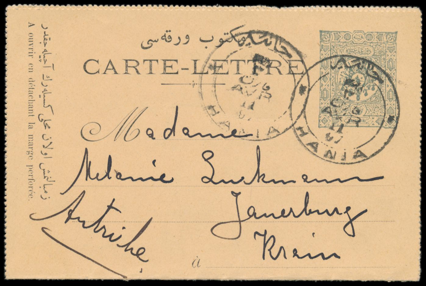 Stempel Hania 11.4.97 auf Kartenbrief 1 Pia. nach Österreich, geschrieben "Suda, 10.4.1897", Ankunftstempel Jauerburg 17.4.97, Bedarf