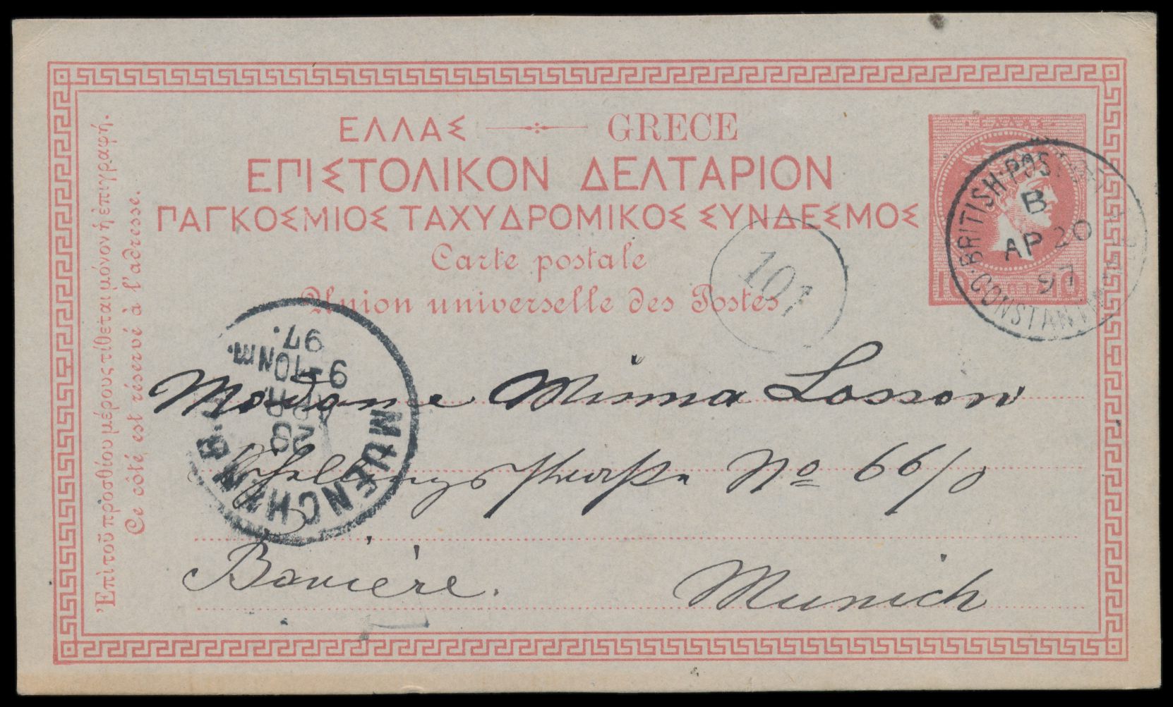 Stempel British Post Office Constantinople 20.4.97 auf Griechenland-Ganzsache 10 L. nach Deutschland, unbeanstandet, Ankunftstempel München 28.4.97, langer Bedarfstext