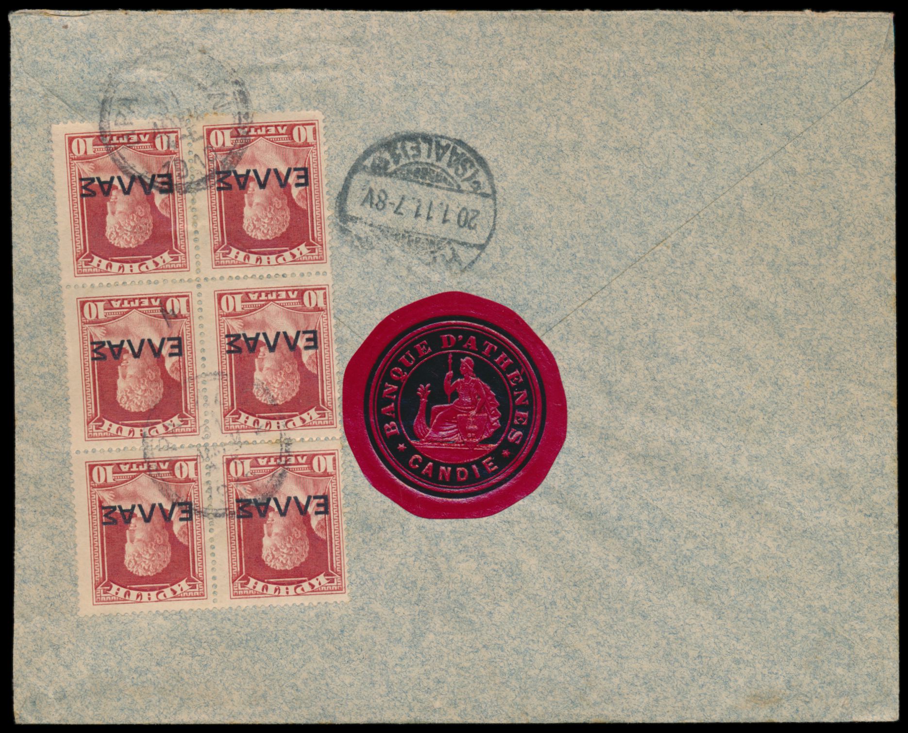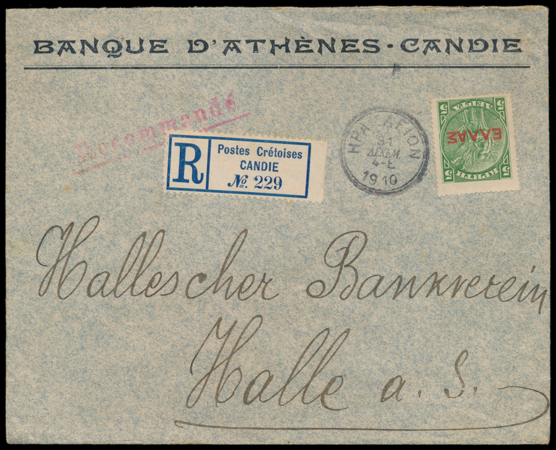 5 L. und Sechserblock 10 L. (rückseitig) mit Londoner Aufdruck auf Einschreibbrief mit Stempel Heraklion 31.12.1910 nach Deutschland, R-Zettel "Postes Crétoises Candie", Ankunftstempel Halle (Saale) 20.1.11, Bedarf