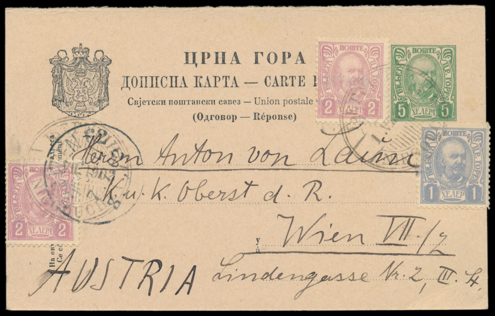 Ganzsachen-Antwortteil 5 H. (Fürst Nikolaus) mit Zusatzfrankatur 1 H. und 2 x 2 H., Stempel Niegouche 1.7.1902, nach Wien, Ankunftstempel 7.7.02, Bedarf