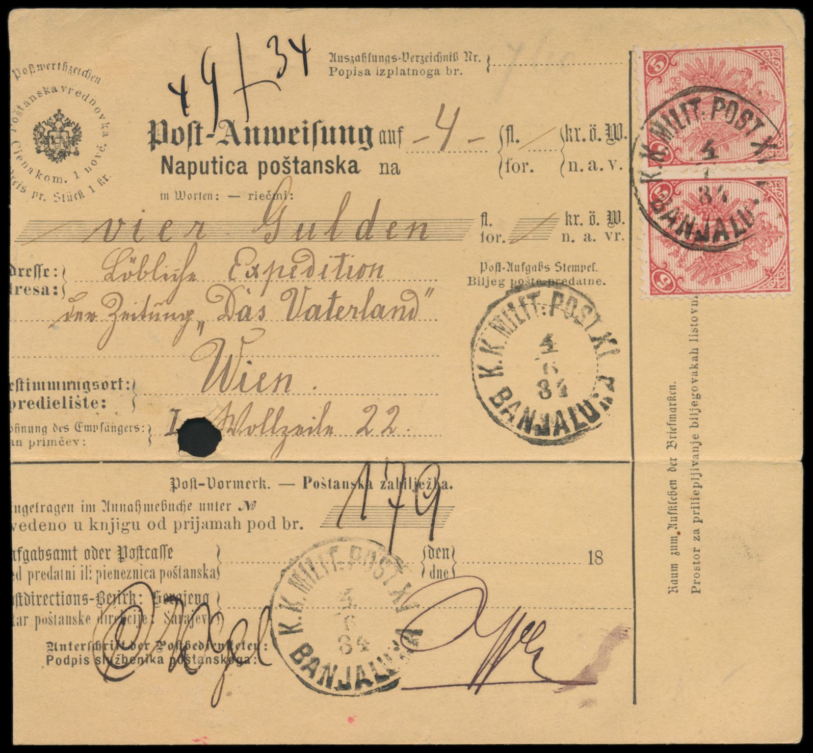 2 x 5 Kr. auf Postanweisung auf 4 Gulden, Stempel K. k. Milit. Post XI. Banjaluka 4.6.84, nach Wien, Ankunftstempel 6.6.84, Formular unten mit waagerechtem Bug