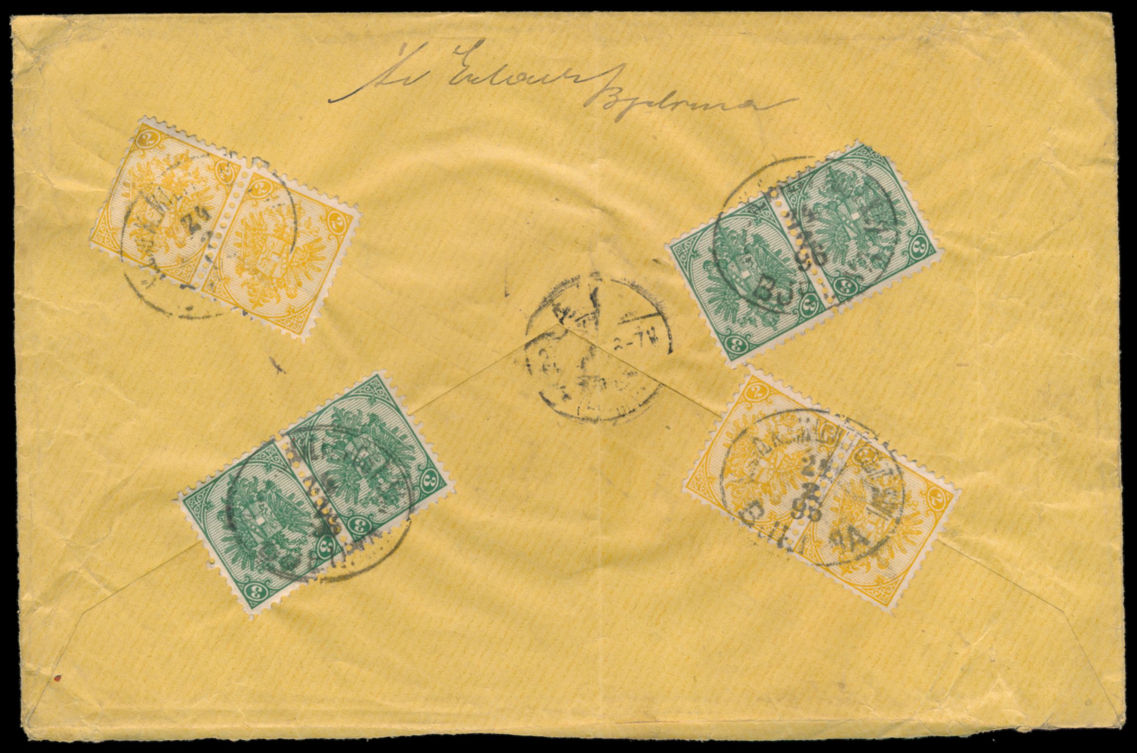 Steindruck 4 x 2 Kr. gelb und 4 x 3 Kr. grün (eine Marke beschädigt) in waagerechten Paaren rückseitig auf Einschreibbrief nach Deutschland, Ovalstempel K. und k. Milit Post Bjelina 24.2.96, Stempel Recom. und handschriftliche Registriernummer, deutscher Eingangs-R-Zettel "Vom Auslande über Dresden 7" , Ankunftstempel 27.2.96, Umschlag hat senkrechten Mittelbug, Bedarf