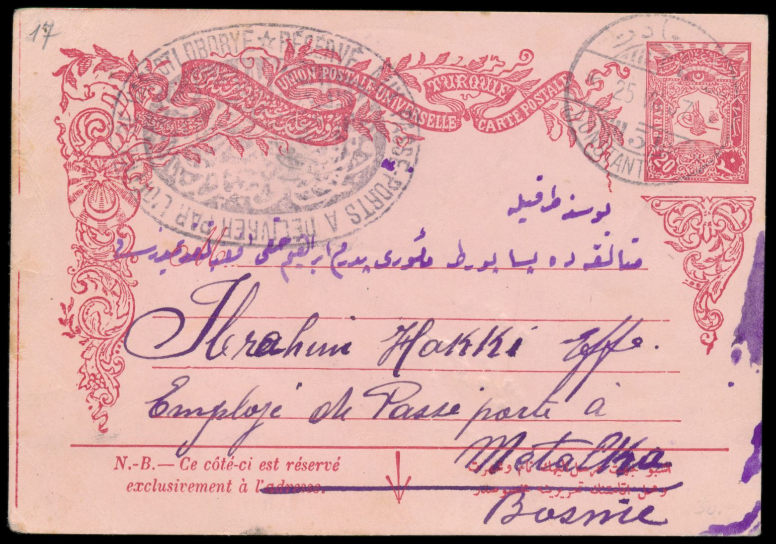 2 Türkei-Ganzsachen 10 Pa. mit Zusatzfrankatur 10 Pa. bzw 20 Pa., beide mit Stempel Constantinople 24.5.07 bzw. 25.7.07 an einen türkischen Beamtem im Passamt von Metalka / Bosnien (im Sandschak von Novipazar) , großer zweisprachiger (arabisch / französisch) Ovalstempel "Reservé aux Passe-Ports a Delivrer par L´Office Vaslotlobdryé", Bedarf
