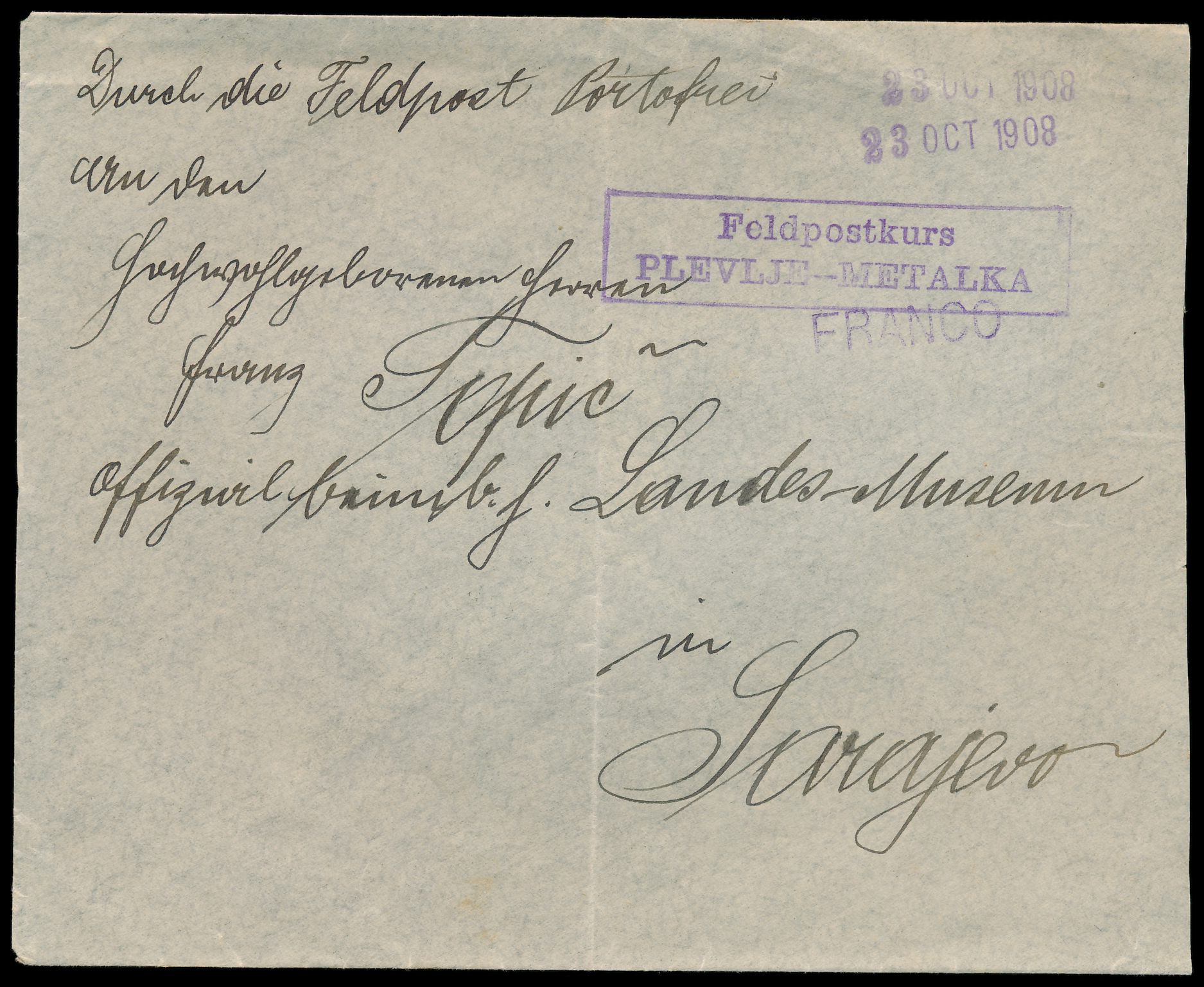 Bosnien-Herzegowina, Sandschak von Novi Pazar: Feldpostbrief nach Sarajevo, violetter Rahmenstempel Feldpostkurs / Plevlje - Metalka, L1 Franco und Datum-L1 23. Oct 1908, undeutlicher Ankunftstempel Sarajevo, senkrechter Mittelbug, Bedarf