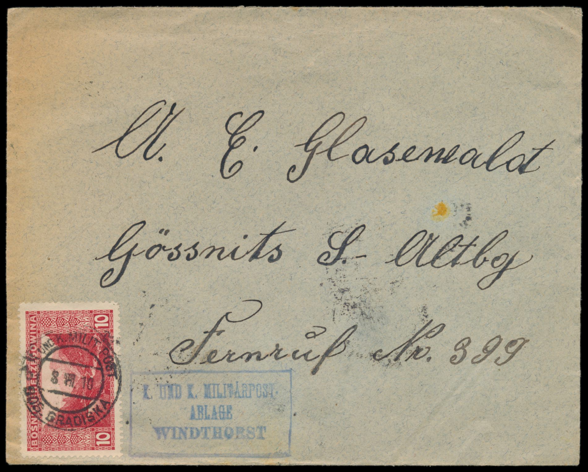 10 H. auf Brief mit Stempel K. und k. Milit. Post Bos. Gradiska 8.7.10 und violettem R3 K. u. k. Militärpost / Ablage / Windthorst, Siedlung von Deutschen aus dem Rheinland und Hannover, nach Gössnitz, Bedarf
