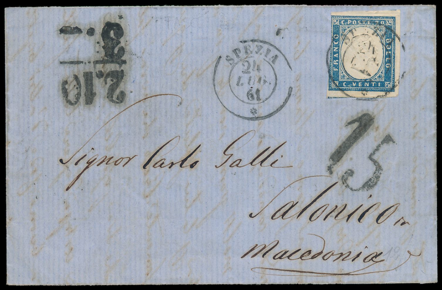 Sardinien 20 C. (links Markenbild angeschnitten) auf Faltbriefhülle (Ober- und Unterklappe fehlend) mit Stempel Spezia 24.7.61 nach Saloniki, wegen Unterbrechung des Postvertrages zwischen Sardinien und Österreich nur "franco Grenze" möglich, österreichischer Taxstempel "15" Nkr. (für die 3. Entfernungsstufe) und seltener Umrechnungsstempel "2.10. / 3.- (2.10 Piaster + 3 Pia. Österr. Lloyd-Porto), rückseitig Durchgangsstempel Genova 25.7.61 und Amb. Milano Desenzano, undeutlicher Ankunftstempel des österreichischen Postamts Salonich