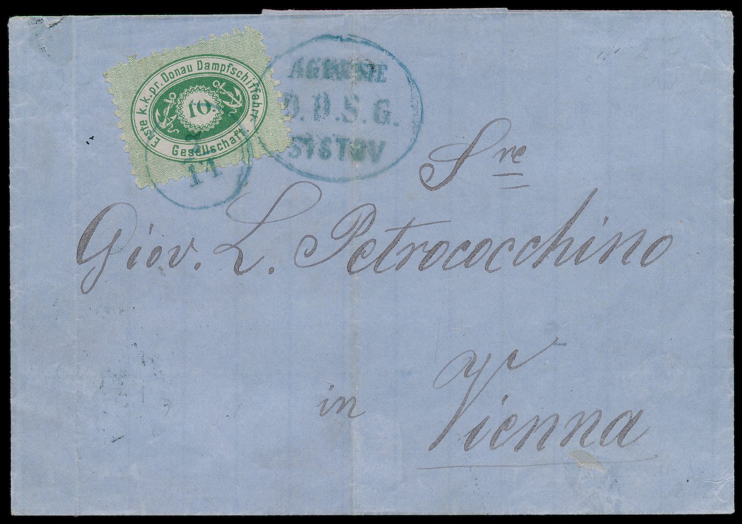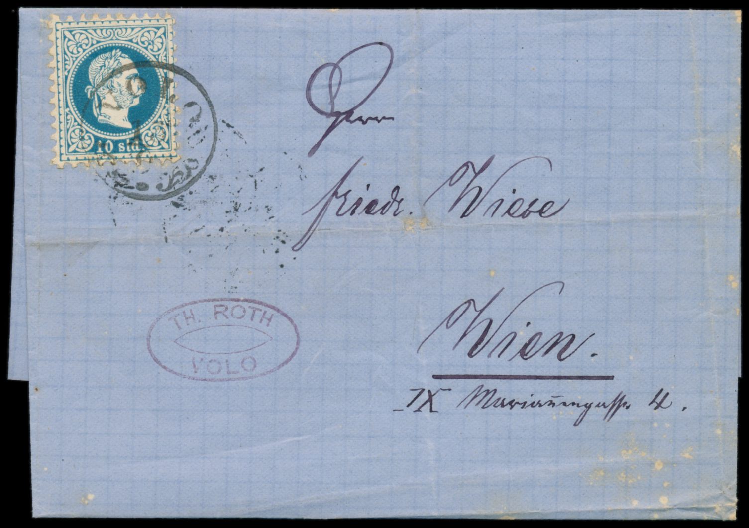 Ausgabe 1867 10 Soldi auf Faltbriefhülle nach Wien, Stempel Volo 13.9.(1877), Durchgangsstempel Trieste 20.9., Ankunftstempel Alsergrund Wien 22.9.77, senkrechter und waagerechter Registraturbug