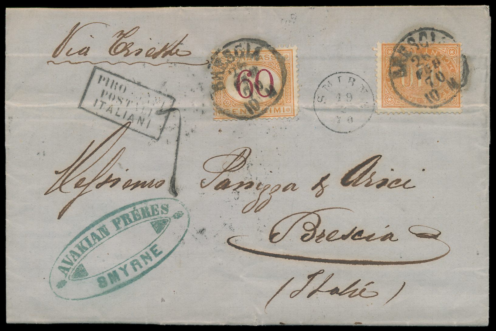 kleiner K1 Smirne 19.2.70 auf unfrankiertem Faltbrief nach Italien, R3 Piroscafi Postali Italiani, Durchgangsstempel Brindisi und Milano, Ankunftstempel Brescia 26.2.70, Italien-Portomarken 0,10 (Ausgabe 1869) und 60 C. (Ausgabe 1870, kleiner Eckfehler rechts unten) frankiert, Stempel Brescia 25.2.70, zwei schwache Registraturbüge durch Frankatur, mit komplettem Inhalt