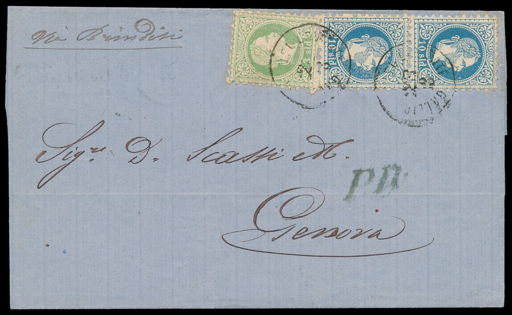 Ausgabe 1867: 3 Sld. und 2 x 10 Sld. (grober Druck) auf Faltbriefhülle nach Italien, 2 x seltener K1 Gallipoli nel Levante 23.8.72, etwas undeutlich, L1 P.D., Durchgangsstempel Brindisi 28.8.72, Ankunftstempel Genova 29.8.72