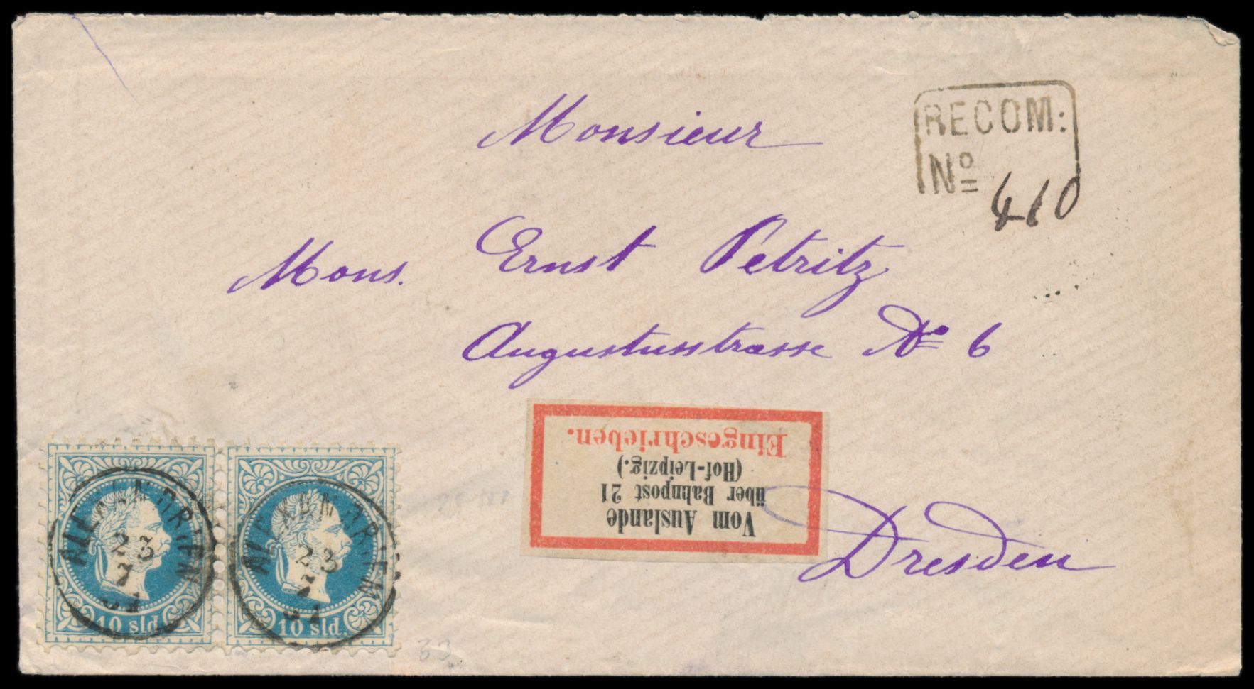 waagerechtes Paar 10 Soldi (Ausgabe 1867) auf Einschreibbrief nach Dresden, 2 x zentrischer Stempel Alexandrien 23.7.81, Rahmenstempel "Recom: No." und handschriftliche Nummer, Durchgangsstempel Napoli 28.7.81, seltener R-Zettel "Vom Auslande über Bahnpost 21 (Hof - Leipzig)", Ankunftstempel Dresden 31.7.81