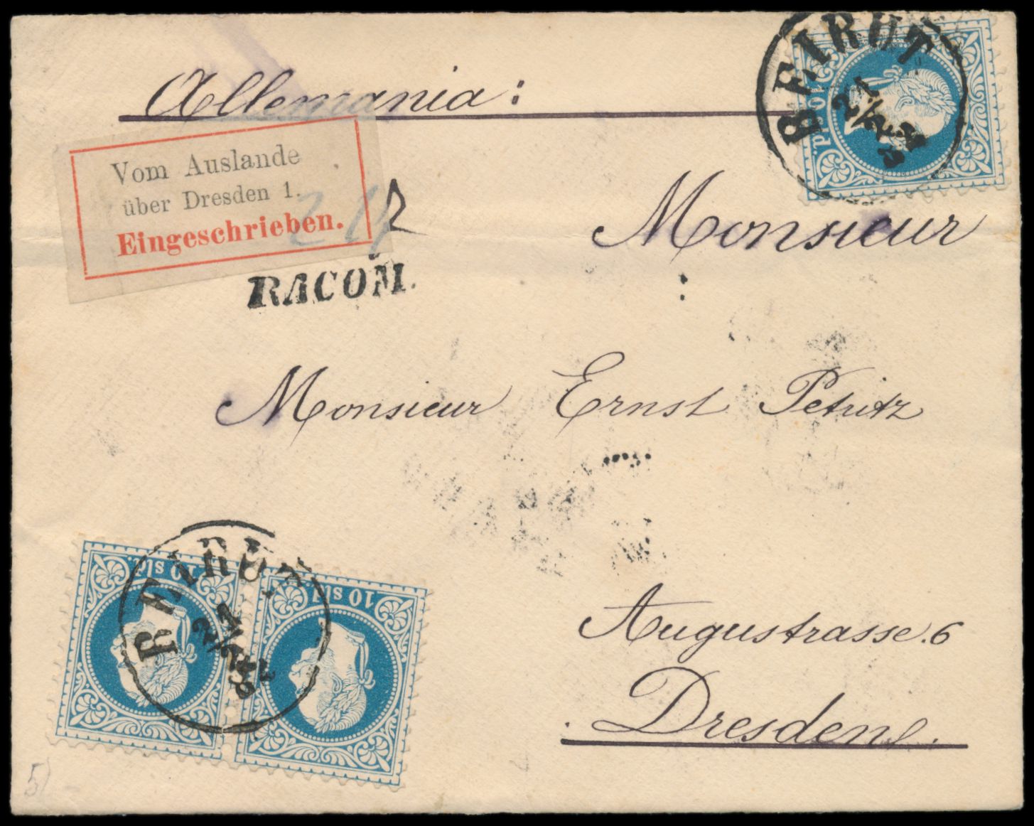 waagerechtes Paar und Einzelmarke 10 Soldi (Ausgabe 1867) auf Einschreibbrief mit Stempel Beirut 21.2.82 nach Dresden, Einzeiler "Recom." und handschriftliche Nummer, seltener R-Zettel "Vom Auslande über Dresden 1", Ankunftstempel 8.3.83
